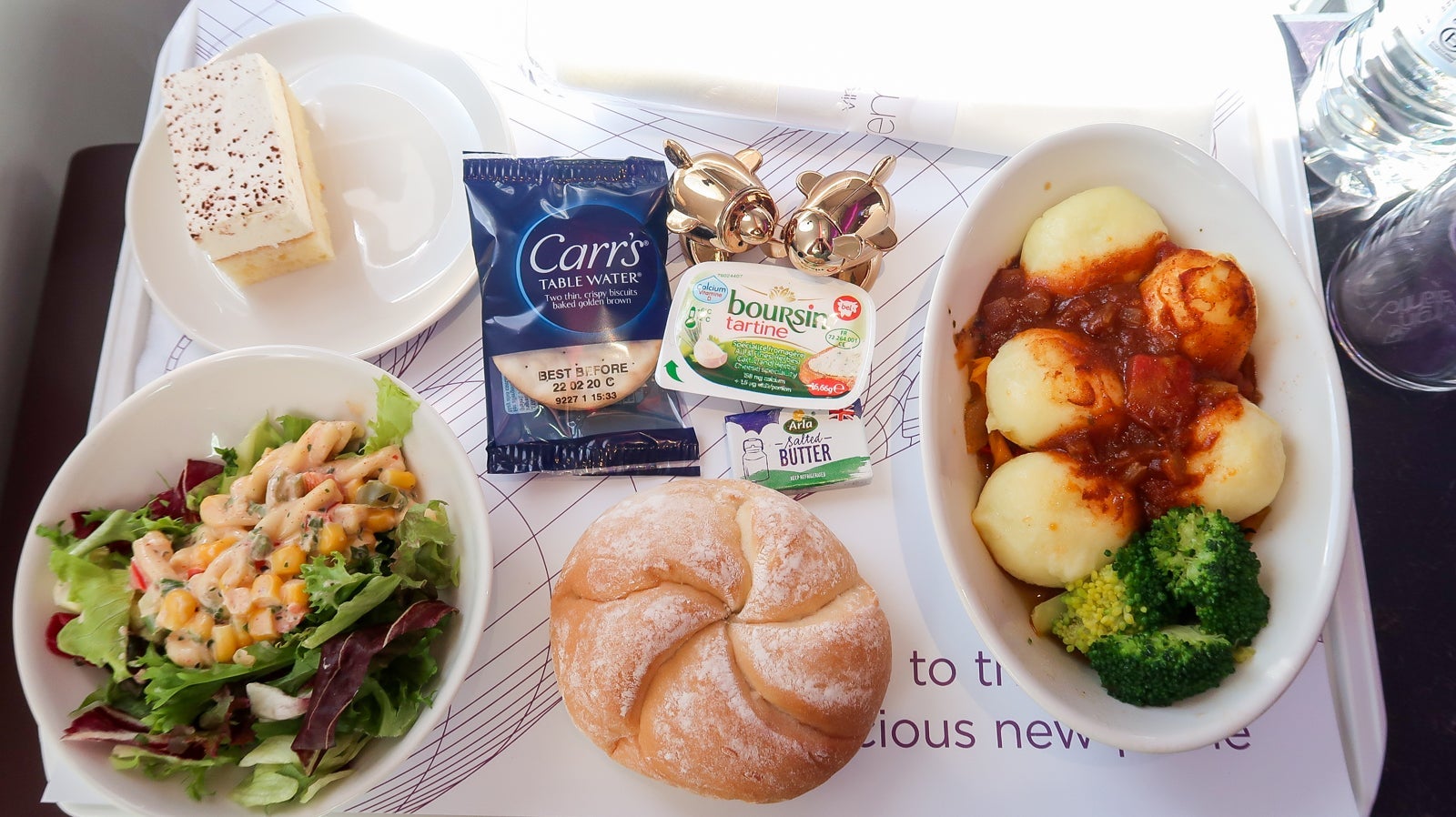 About 20 minutes later, the crew came around the cabin with meals. All three courses — appetizer, main and dessert — were served at the same time, and I appreciated that they expedited the meal service this way. To start, there was only one option: a Cajun pasta salad of fusilli, mixed leaves and mustard vinaigrette. I found the salad to be absolutely delightful. There was definitely a Cajun kick to it, and the twang from the mustard made it really enjoyable.