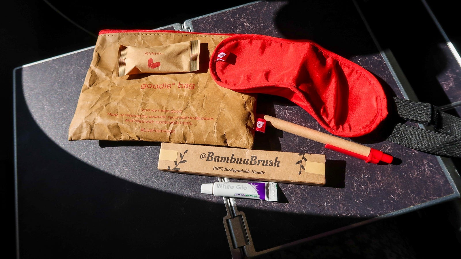 Inside were more environmentally friendly products, such as a bamboo toothbrush, a small tube of toothpaste, paper-wrapped pen, eye mask and earplugs.