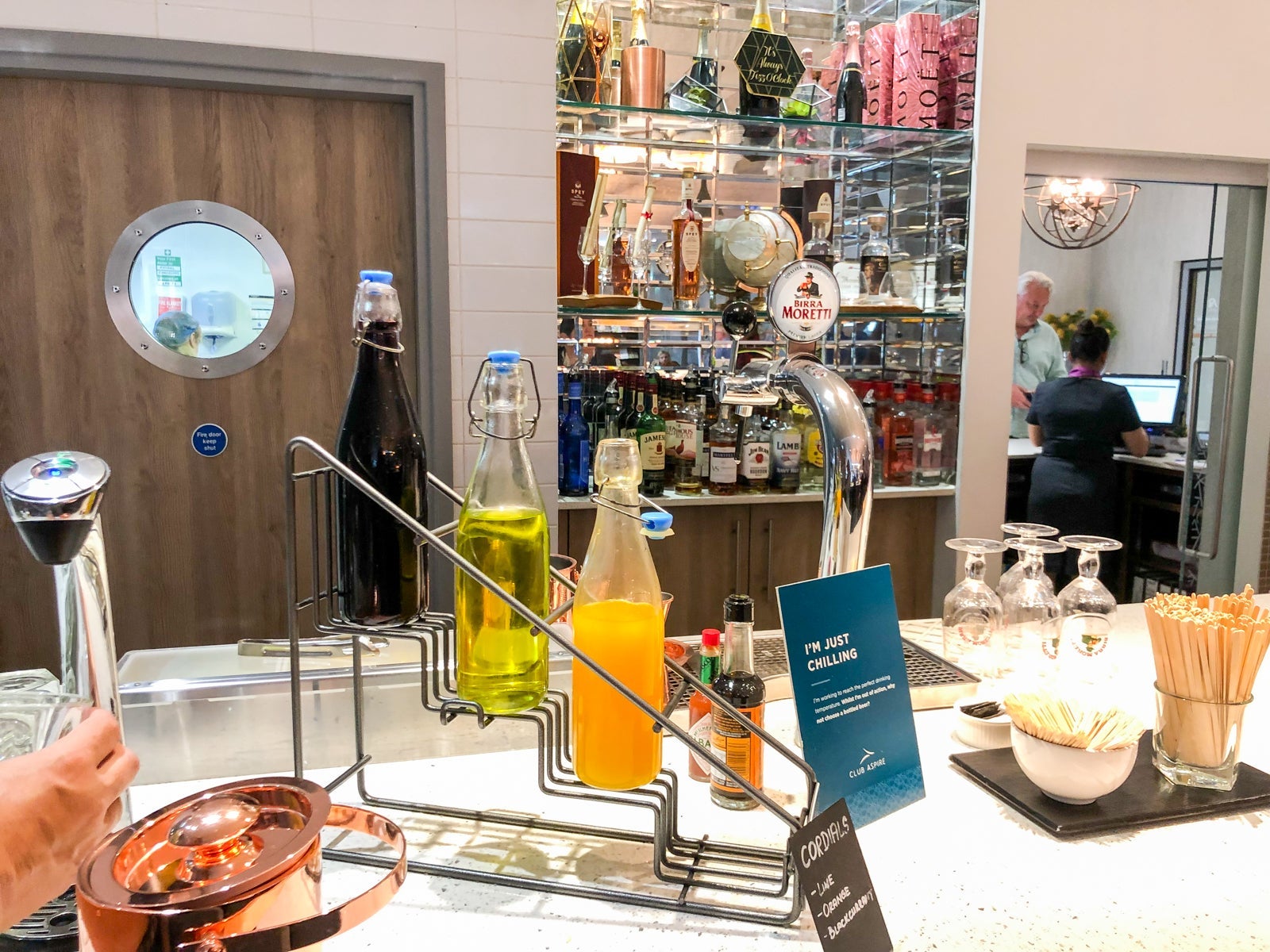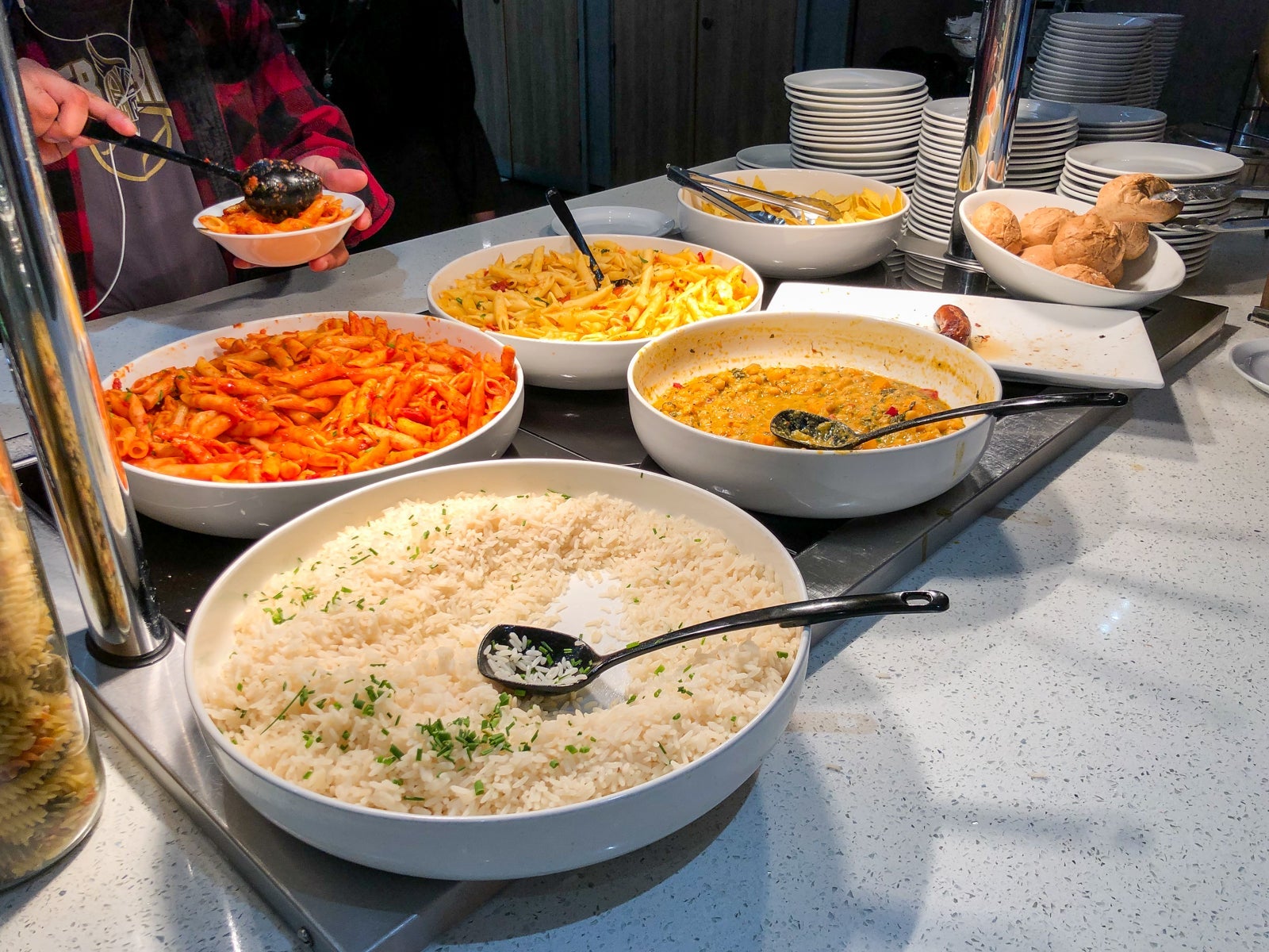 As far as food, there was a decent selection, both hot and cold. Hot options seemed to be carb heavy: rice, two kinds of penne pasta and what appeared to be a chickpea dish. Meanwhile, the cold platters featured green salads, fresh vegetables and a couple other pasta-centric salad dishes. There was also a bar with bartender service. I didn't eat anything, as I wasn't hungry and wanted to save my appetite for when I got on board.
