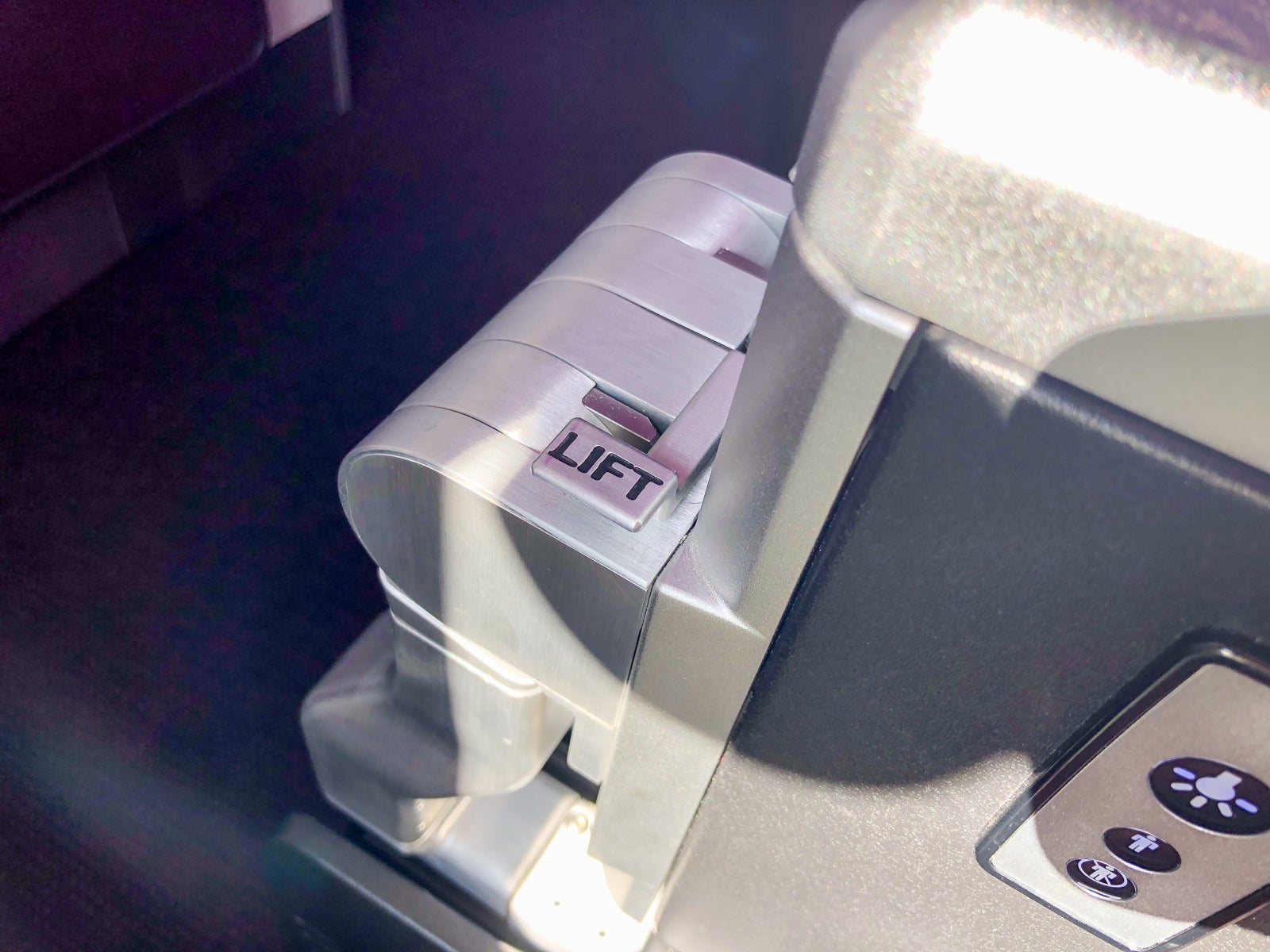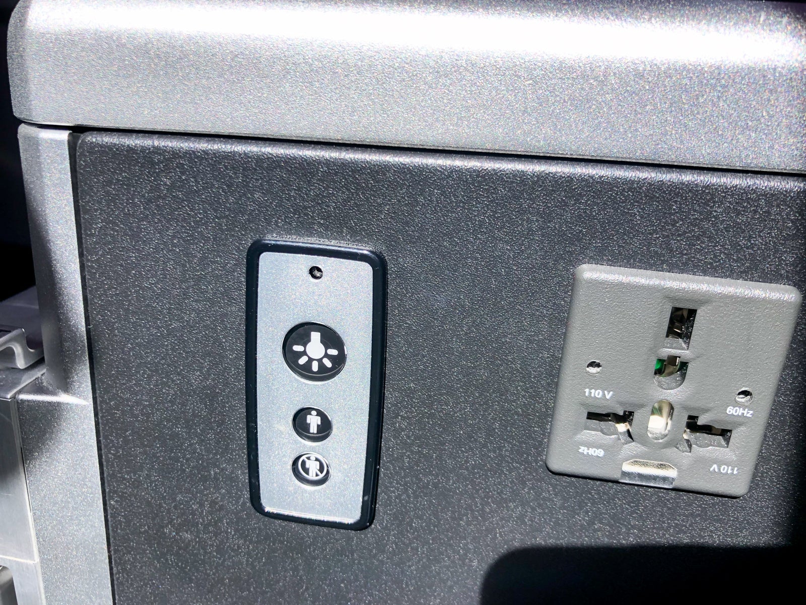 In addition to the USB port with the IFE screen, there was a universal power outlet on the side of the seat next to the seat controls. Also there were the crew call button and overhead light switch.