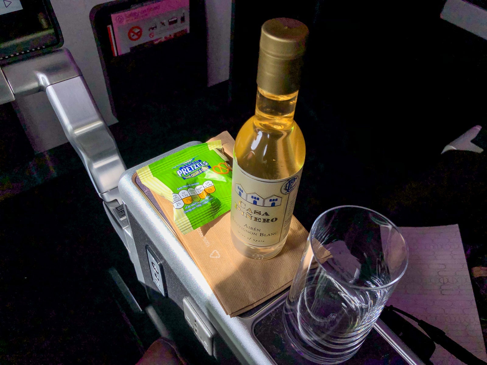 Immediately upon boarding, cabin crew came around the Premium cabin with a choice of water or prosecco. I got a glass of prosecco, which was tasty and light and fit on one of the armrests.