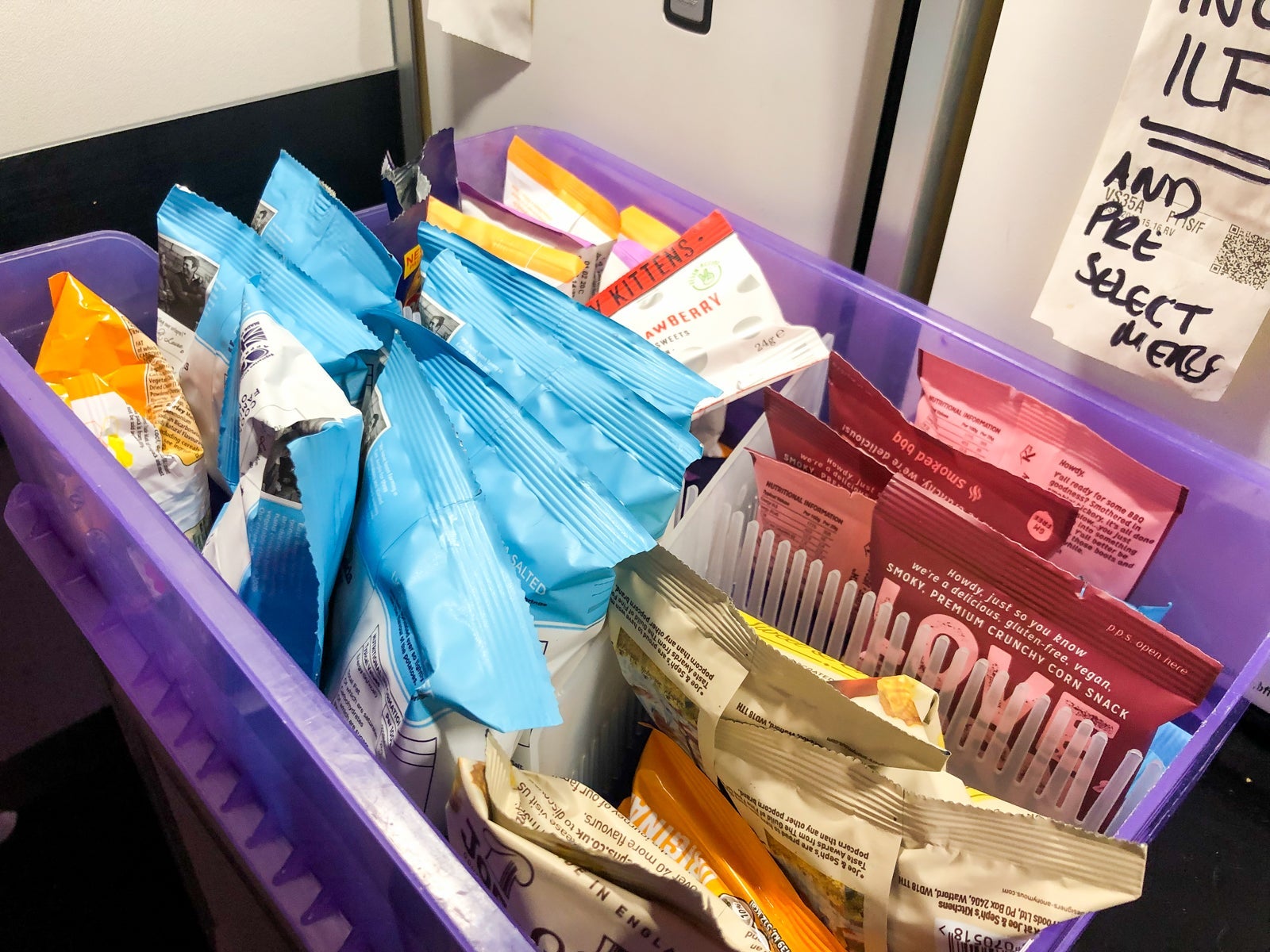During the course of the flight, crew members left out a small bin of chips and snacks for the taking in the galley.