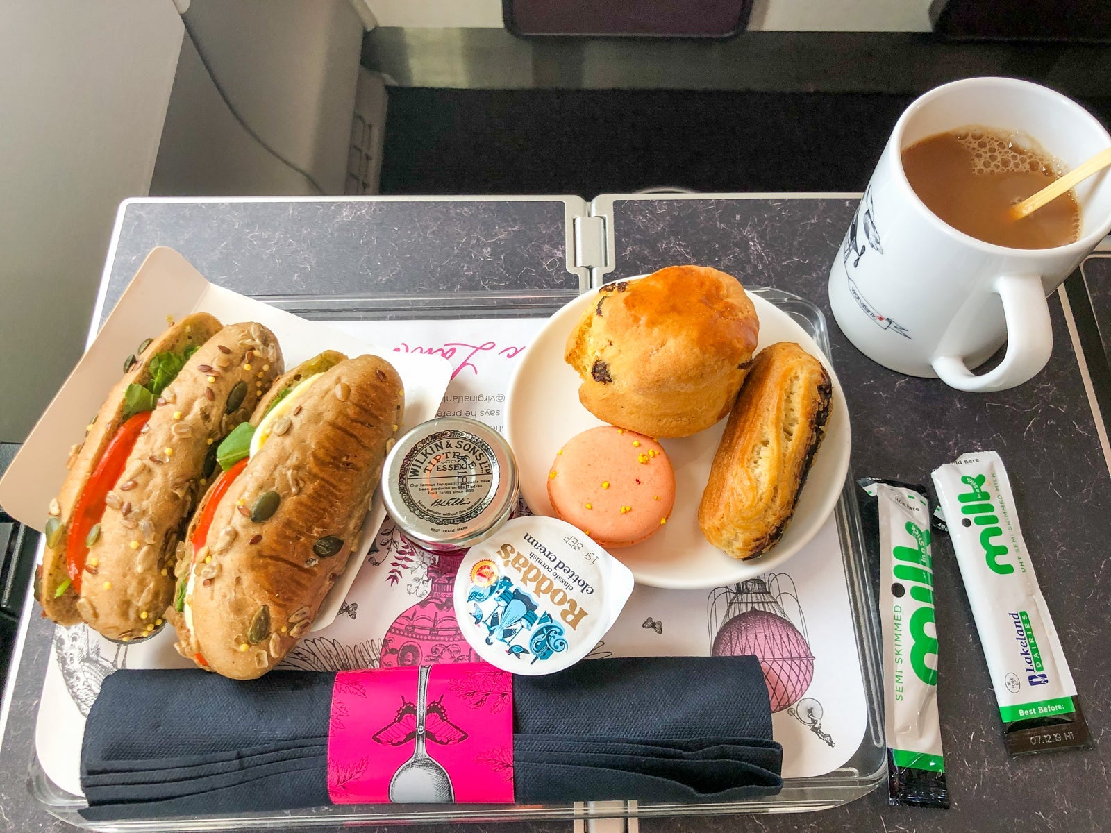 On this flight, the sandwiches included: mozzarella with green pesto, slow-roasted tomato and arugula; and salmon, soft cheese, arugula and cucumber. I got the mozzarella and an English breakfast tea. It was served with a salted-caramel éclair, passion-fruit-and-yuzu macaron and a scone with clotted cream and jam. I found the tea service to be so very pleasant and a phenomenal way to end the flight.