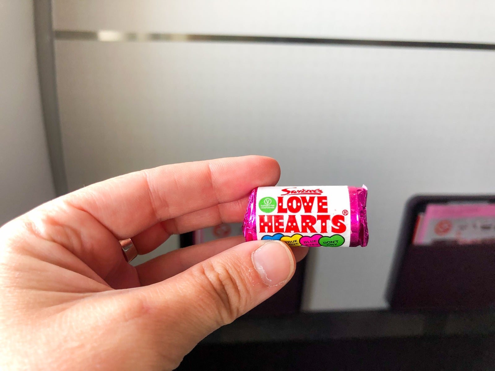 Just before landing, the cabin crew came around with a final treat: Swizzels Love Hearts.