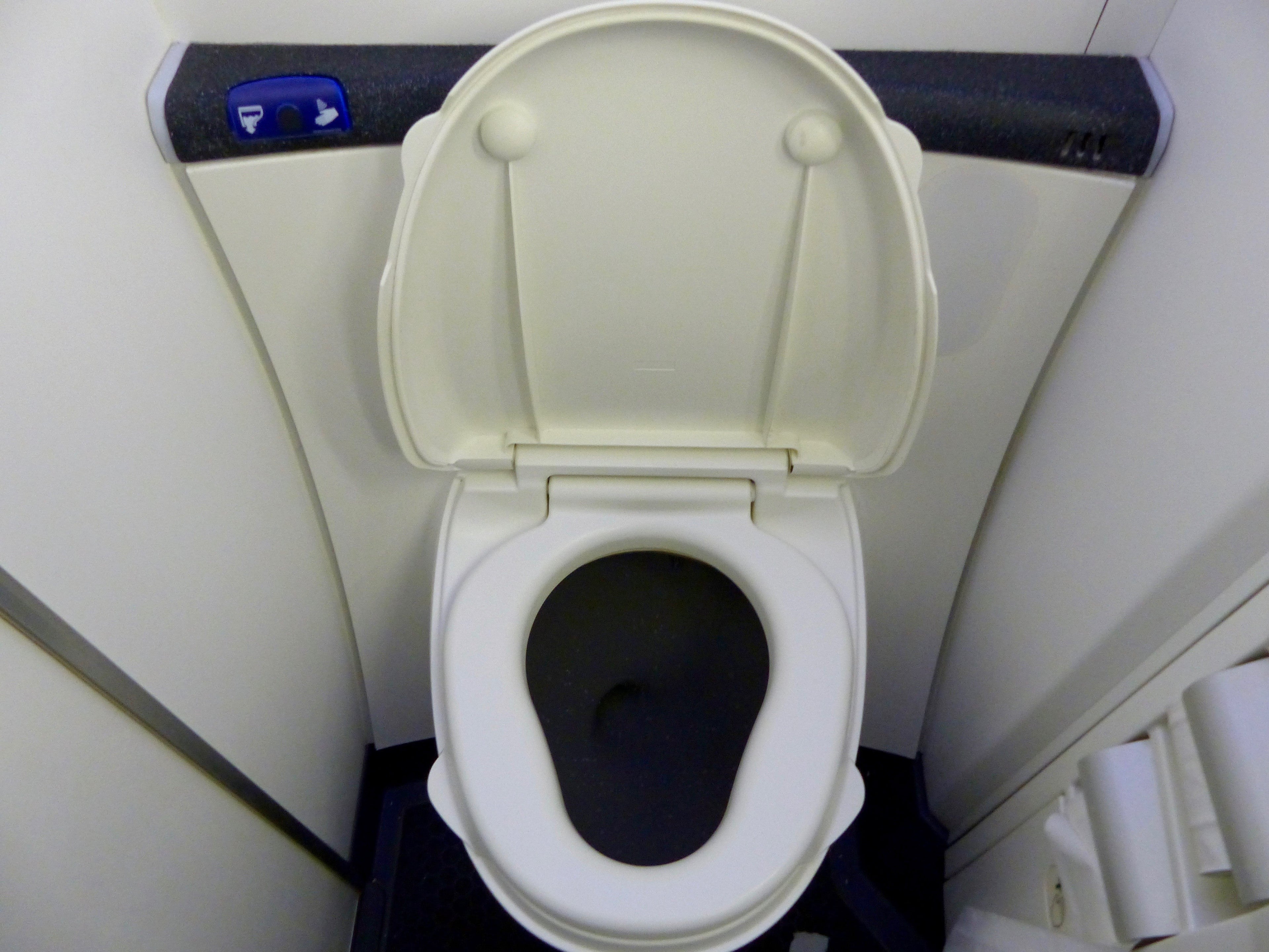 The bathroom was small and cramped, as they always are, but this one had a few modern touches. First, notice the tabs at the outer edges of the toilet, which make you feel like you're touching less germy parts of a public toilet. I still wash my hands as if my life depends on it.