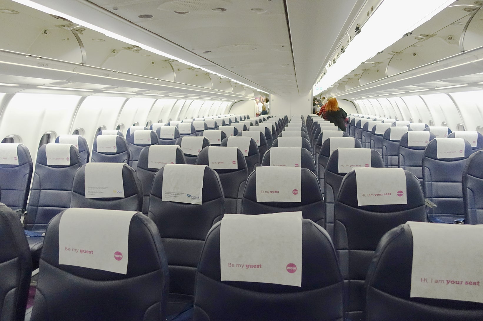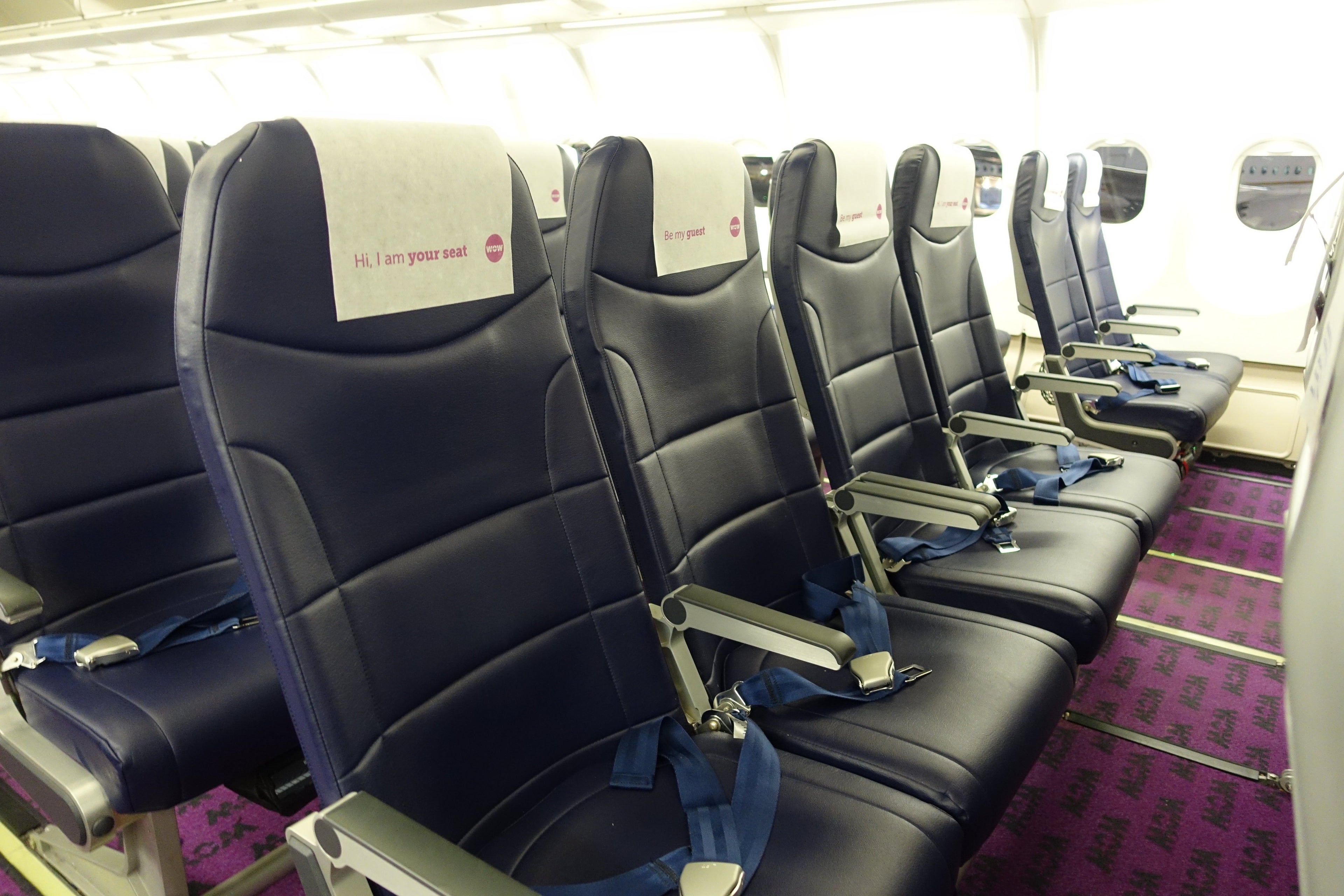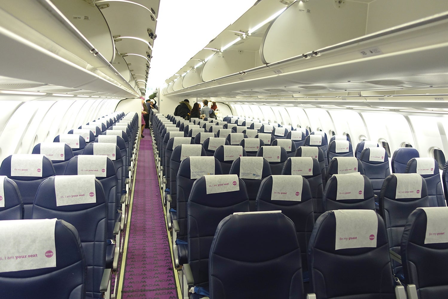 All the seats were dark blue with paper-thin white head covers, while the carpet was purple with "WOW" inscribed all over it. The cabin felt sterile and unwelcoming but mood lighting could have easily fixed that.