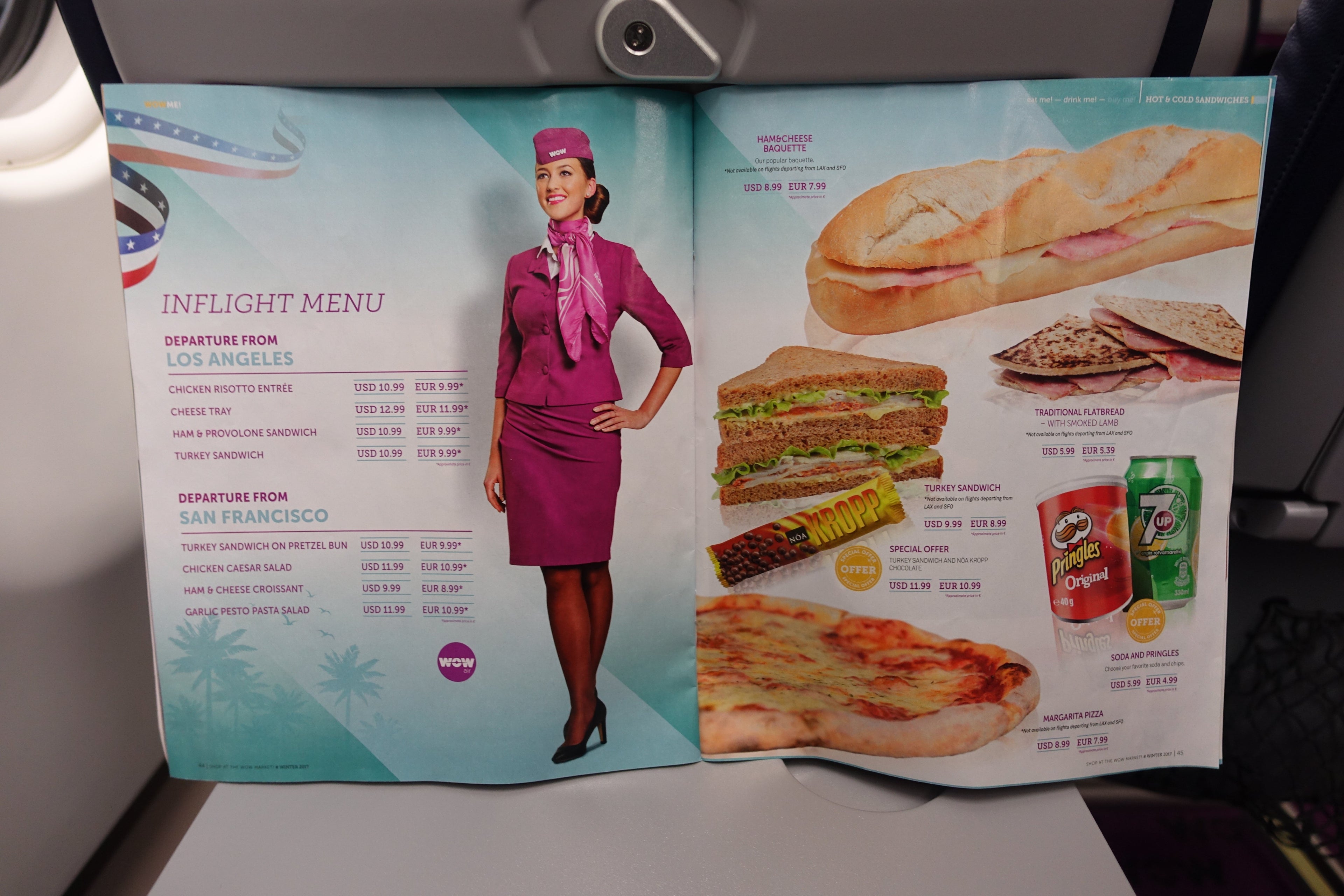 As I said above, if you wanted anything to eat or drink, you had to pay for it, even if all you wanted was water. I passed on the food but did get a few photos of the menu and prices, which seemed reasonable compared to other airlines. WOW also had a special menu for departures from LA and San Francisco, but it only included four choices. A fellow passenger told me their ham and cheese croissant was nothing special but not disgusting, so that's good to know.