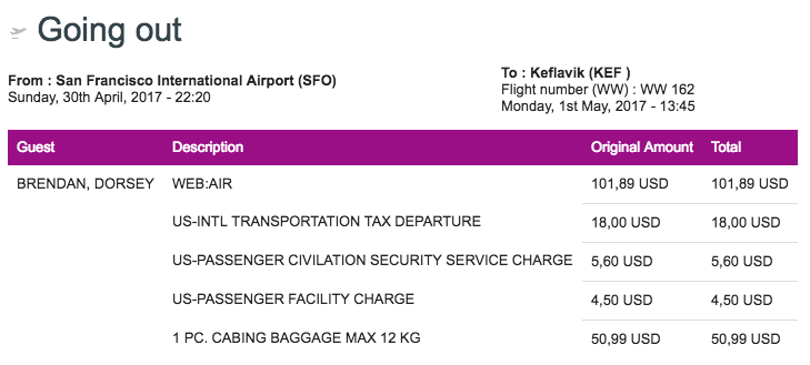 Here's how the airline broke down bag fees from San Francisco to Reykjavik when I was traveling — this might vary from what prices are like now, since it really depends on your route and travel dates. Note that all prices are one-way: