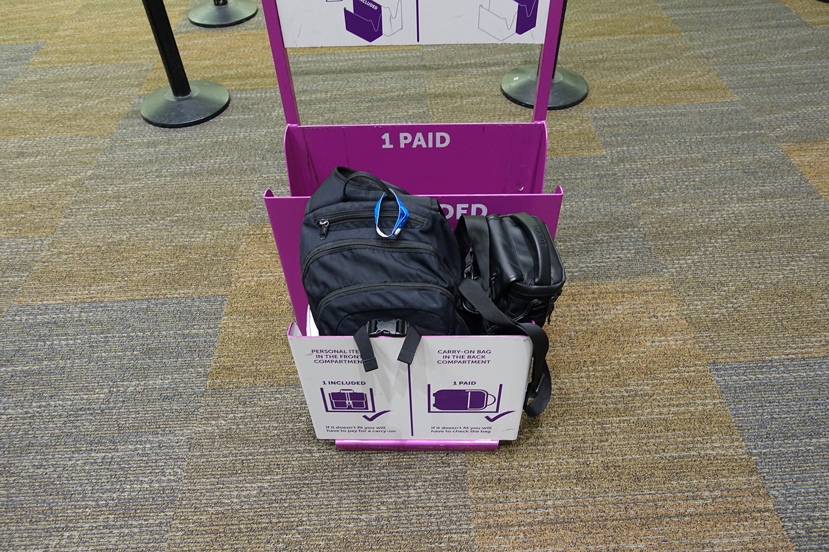 There was yet another stand at the gate where you could check the size of your bags. The staff also required everyone to come to the front of the gate and tag them according to the type of items you were carrying, something you won't normally have to worry about doing if you're flying with a full-service carrier. My two bags were tagged — one as a carry-on, the other as a personal item — although both of them fit neatly inside the personal item box.