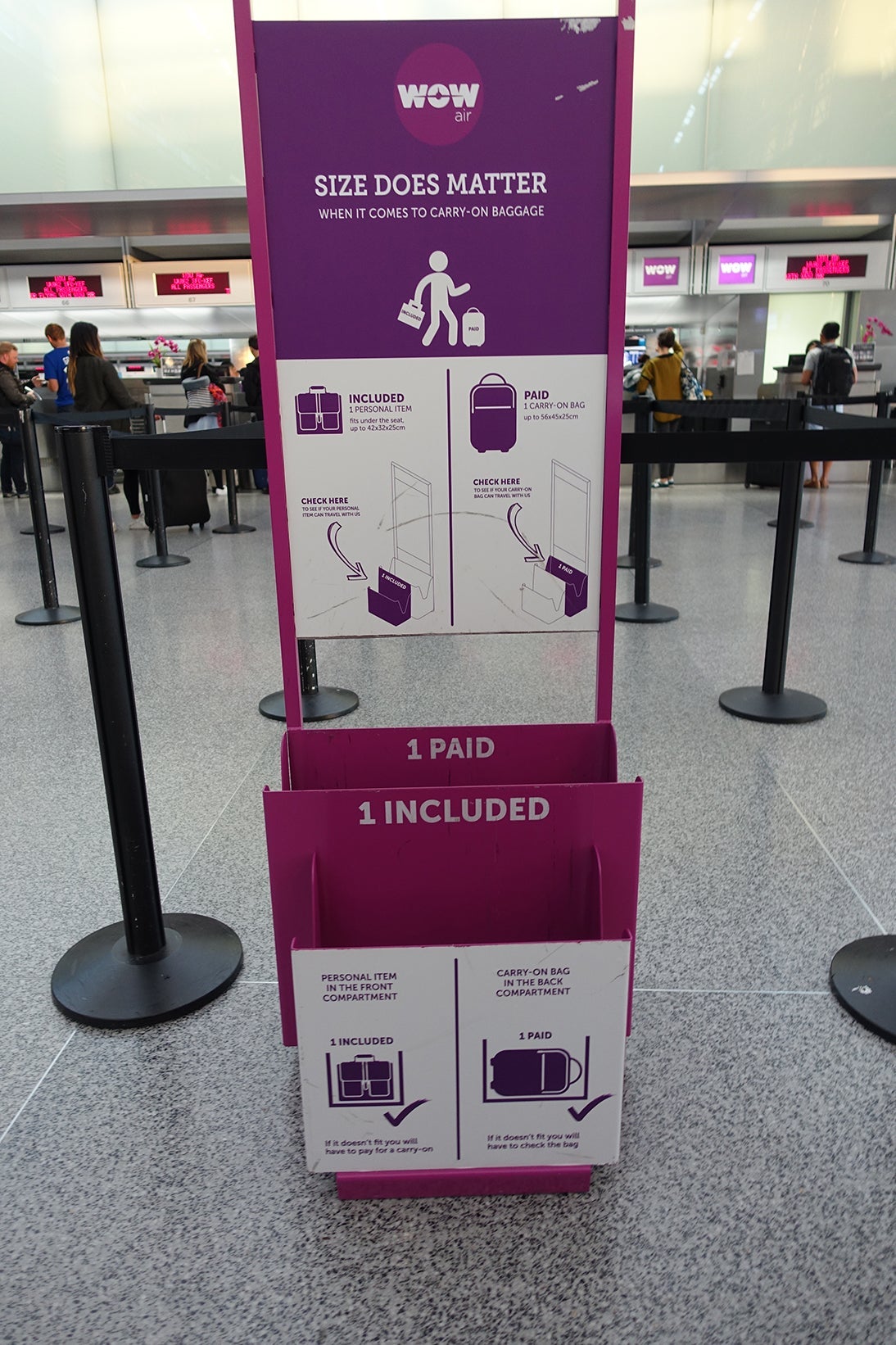 I appreciated that WOW had a kiosk where you could check the size of your bag before you went through the gate. Hopefully, people realize that they need to pay for carry-on bags at the check-in desk and not when they get to the gate, where they'd be subject to even higher bag fees.