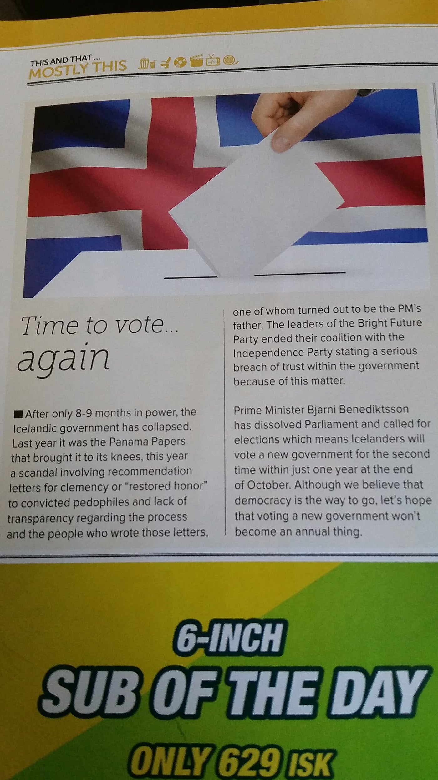 The highlight of this uneventful hop to KEF turned out to be the WOW inflight magazine — a funny, smart read, with a light tone very much in keeping with a Euro-cool, if no-frills, brand. It even featured a pretty opinionated news item on the upcoming Icelandic election. What US or European airline would dare touch politics so openly in its inflight mag?