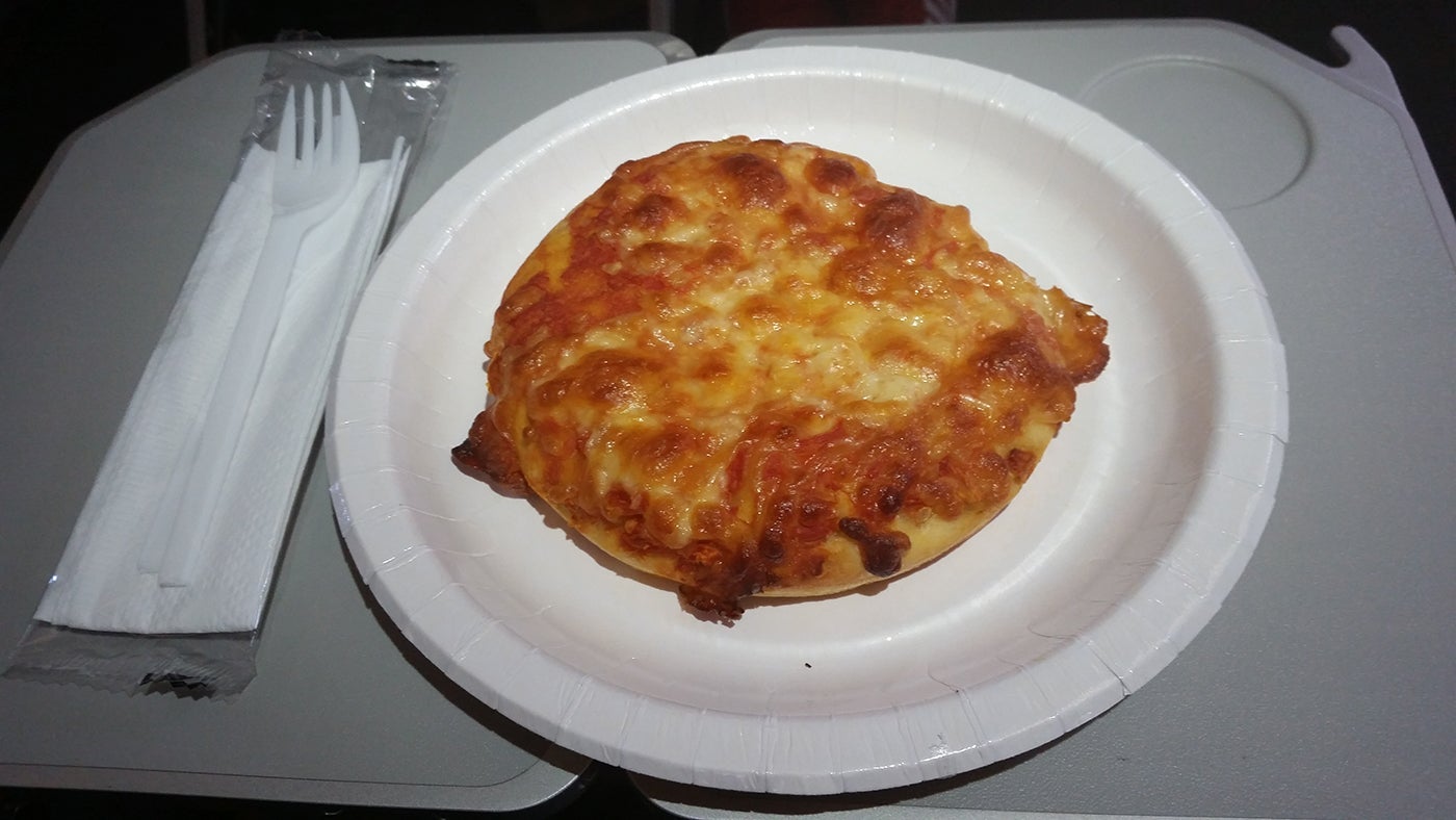 Without an actual meal service, you could order your food when you wanted, and I decided to have mine about three hours after takeoff. When I pressed the call button, a flight attendant showed up immediately and told me my food "might take 10 to 15 minutes." 25 minutes later, something that might charitably be described as burnt imitation mini-pizza was brought to my seat on a paper plate, with a bottle of water. I don't think I've ever had anything worse on a plane before.