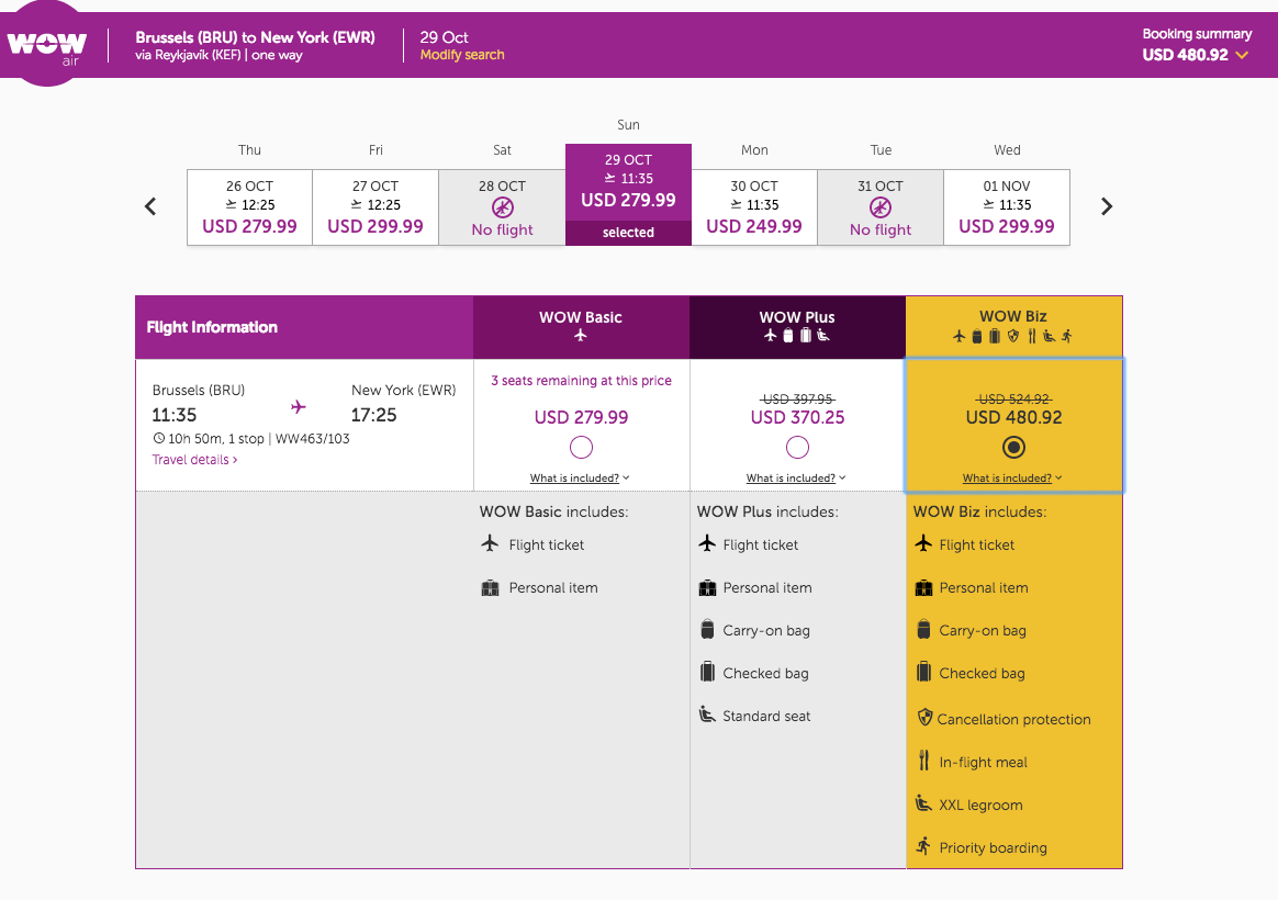My one-way WOW Biz fare from Brussels (BRU) to Newark (EWR) via Reykjavik's Keflavik airport (KEF) came to $480.92, a full $200 more than the admittedly very cheap WOW Basic. Adding individually to the Basic fare all the perks included in the Biz package would have brought it to $494.93. That was still just one-fourth of the fares that Delta and United were offering that day on their Brussels - New York nonstops!