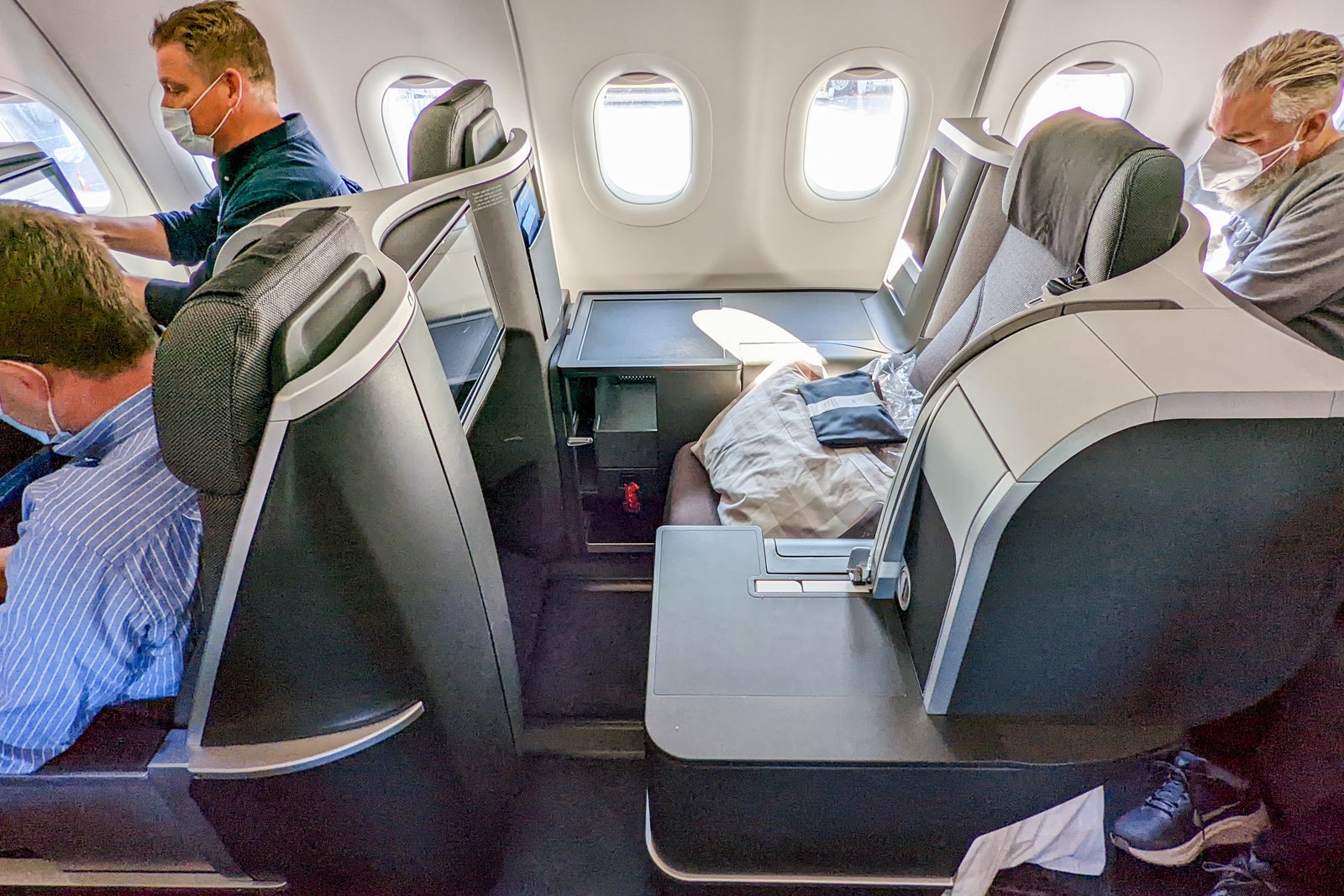 For a new plane in 2022, I do not consider this to be an enjoyable business-class seat for a transatlantic flight. Compare this with JetBlue, which is also operating similar-length transatlantic flights on a narrow-body aircraft — it has chosen a 1-1 layout for its Mint business class, which gives all passengers direct aisle access, storage and privacy.