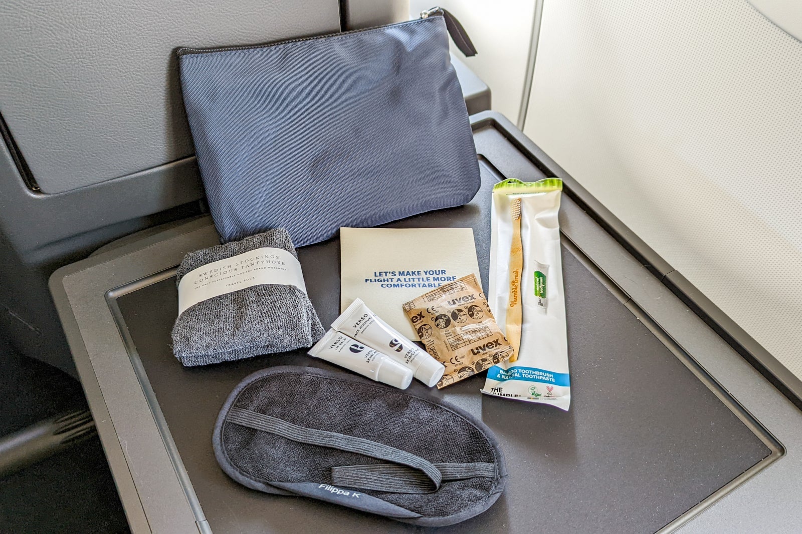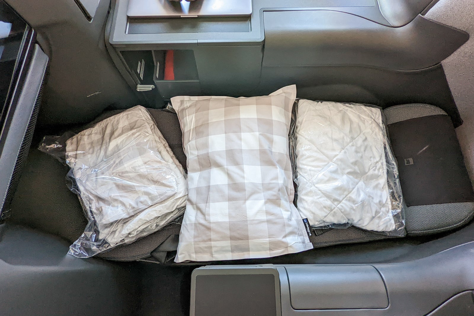 Awaiting me on my seat was an amenity kit, mattress pad, comforter and pillow for this daytime flight. The checkered design of the bedding was a homely nod to Scandinavian design from Swedish premium bed manufacturer Hastens.