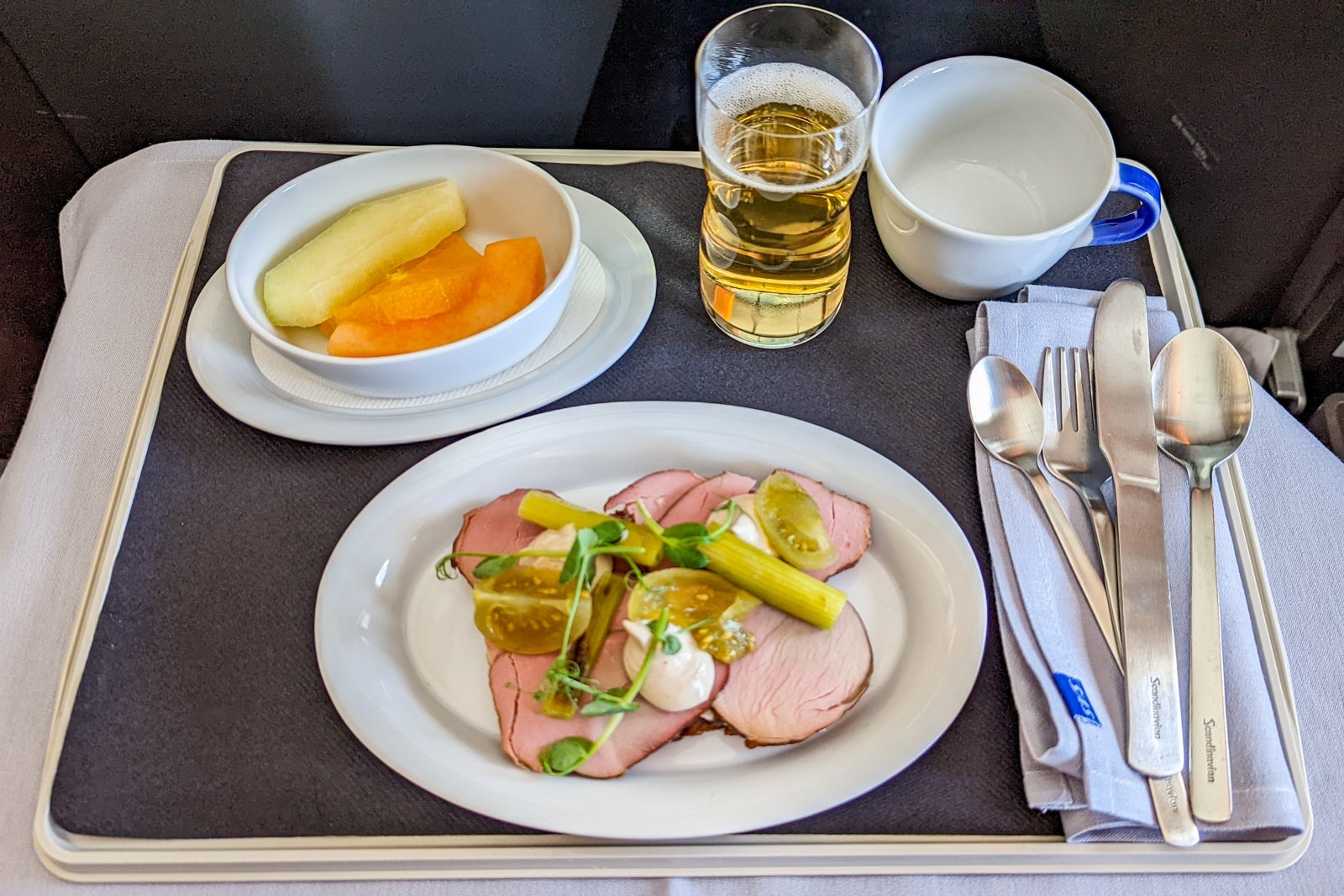 A light meal was served around two hours before landing and consisted of slices of cured pork on dark rye bread. Having eaten similar dishes on visits to Scandinavia, I enjoyed it. The meager fruit salad served on the side with only three pieces of fruit, two of which were melon, could have used some upsizing, however.