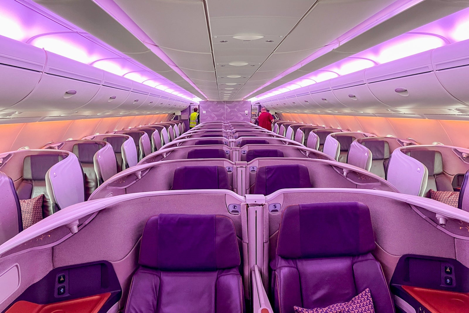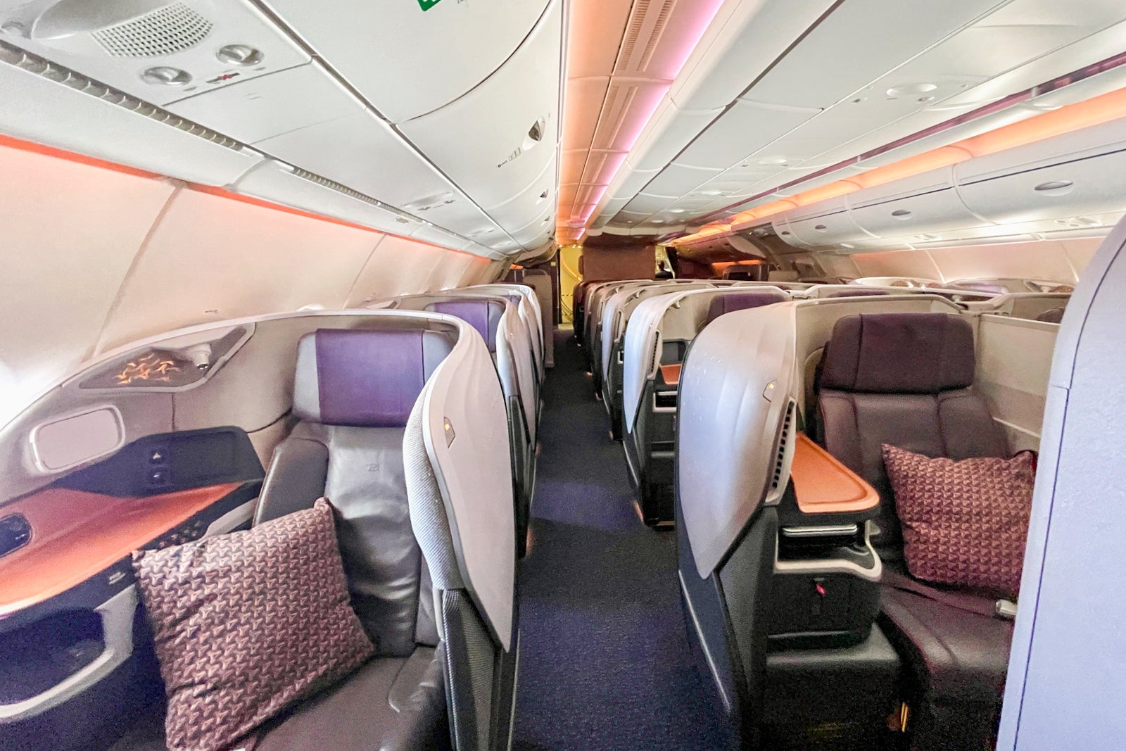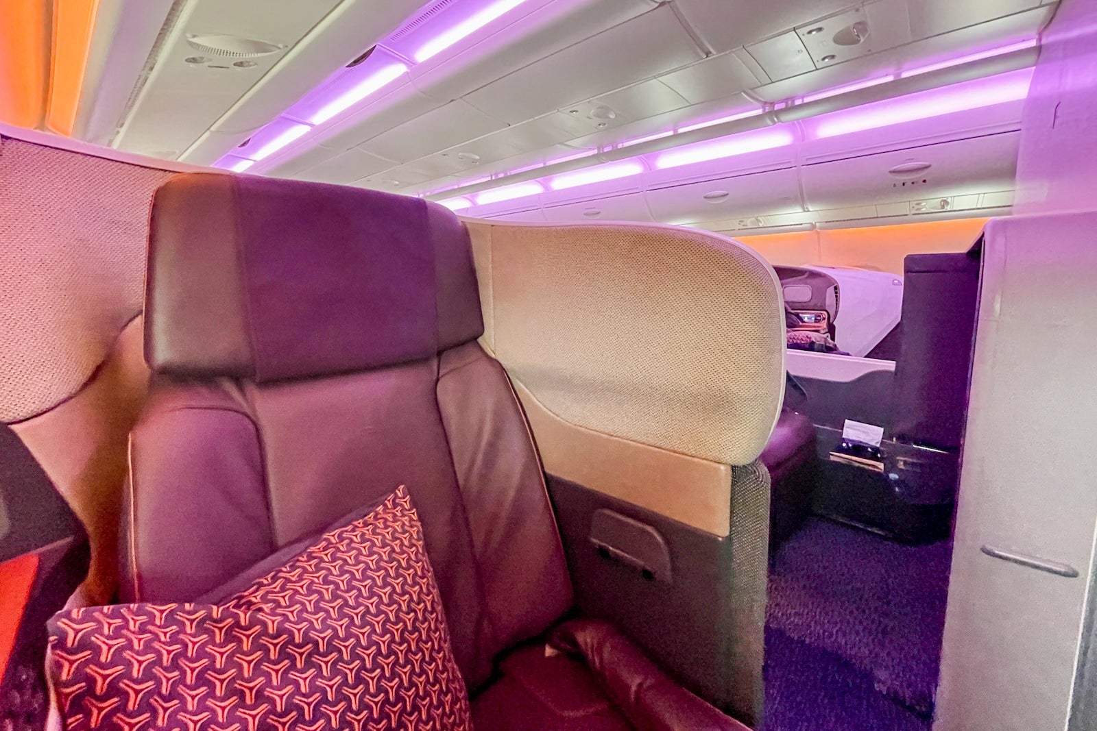 Between the purple-hued Poltrona Frau leather seats with orange piping, sleek mood lighting and lack of overhead bins over the center seats, this was a truly gorgeous cabin.