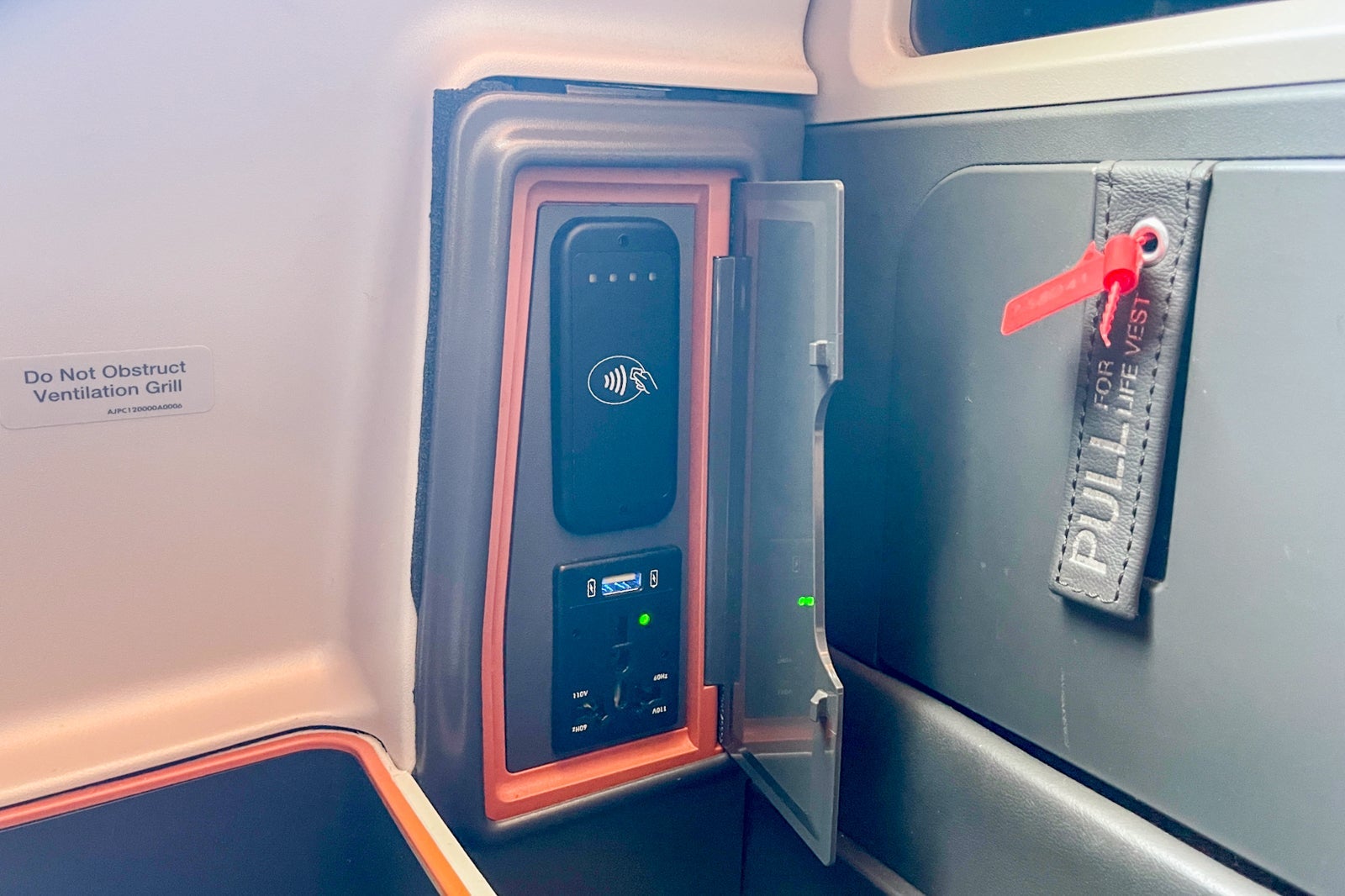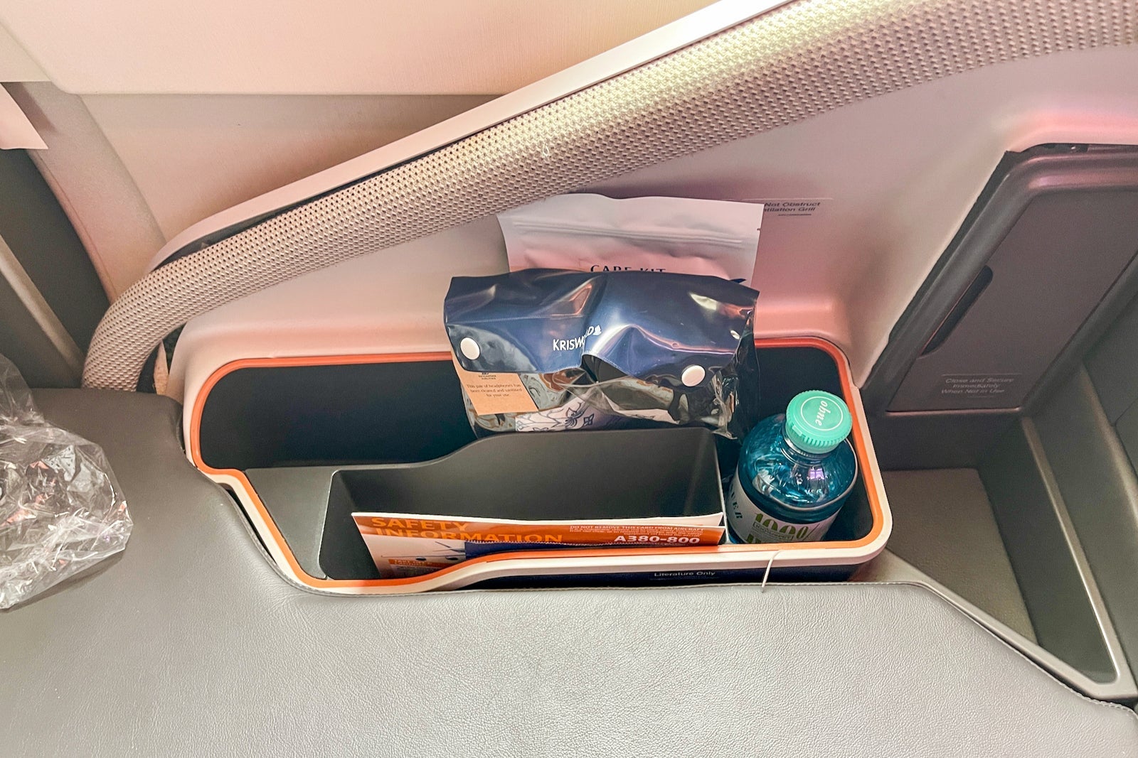 Despite the lack of overhead bins over the center seats, storage wasn't an issue. For starters, you can fit a carry-on-sized bag under the footwell. There's also a small compartment to the side of the seat that can fit some reading material, a water bottle and a laptop. Non-bulkhead seats also had some storage space next to the seatback screen.