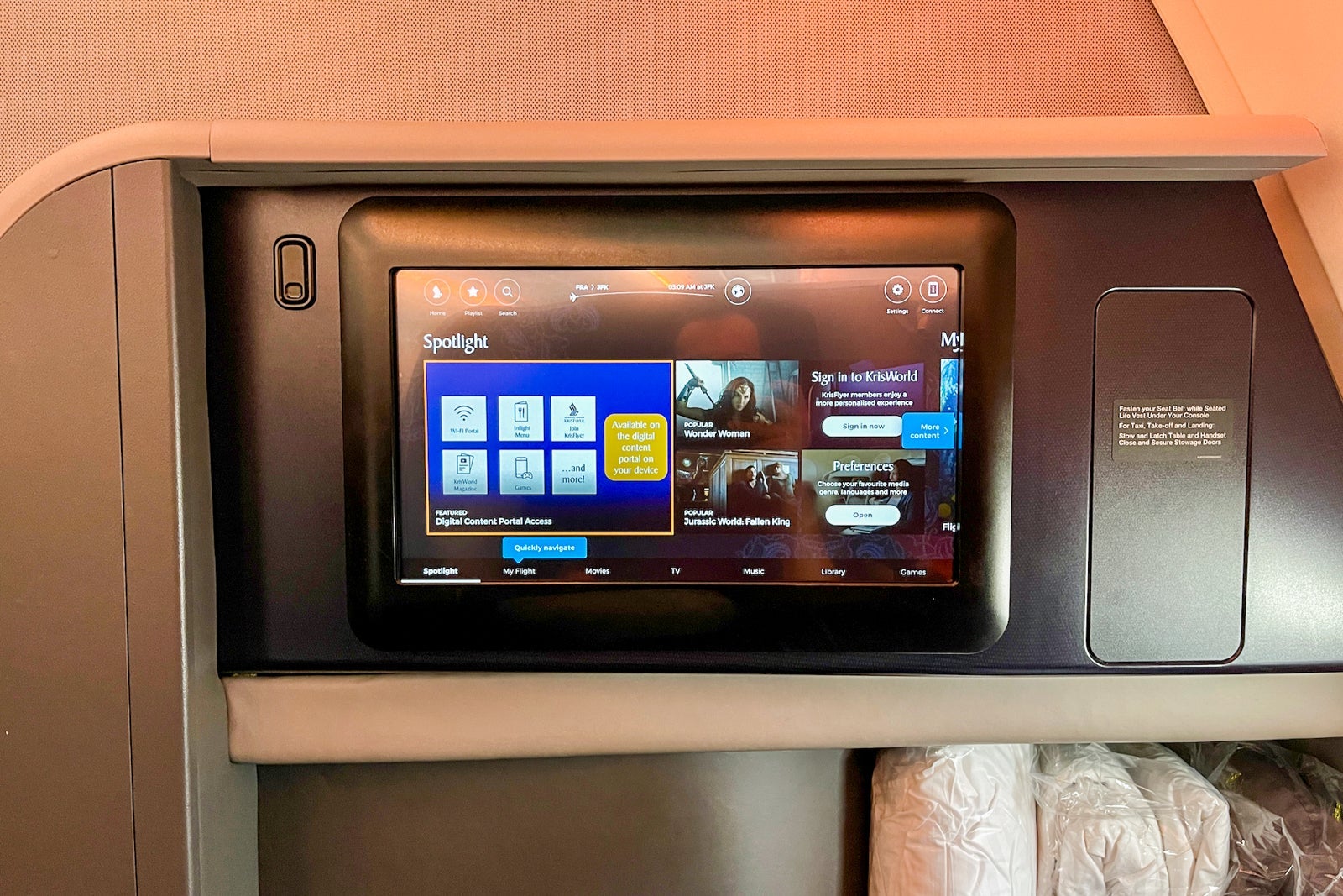 The entertainment screen was crisp and large, measuring 18 inches across diagonally. It could be controlled either directly from the main touchscreen display or via the wired, touchscreen remote. There were hundreds of movies and TV shows to choose from, including relatively new releases. The only downside was that the screen didn't tilt, making it a bit difficult to watch a movie from the lie-flat position.