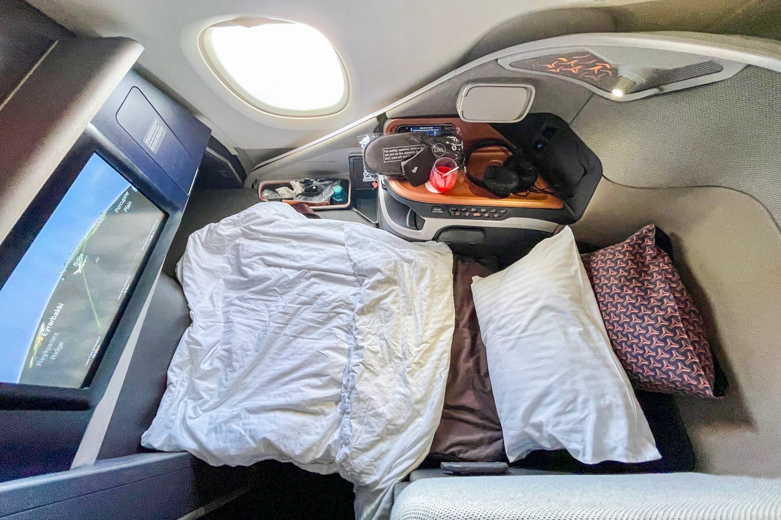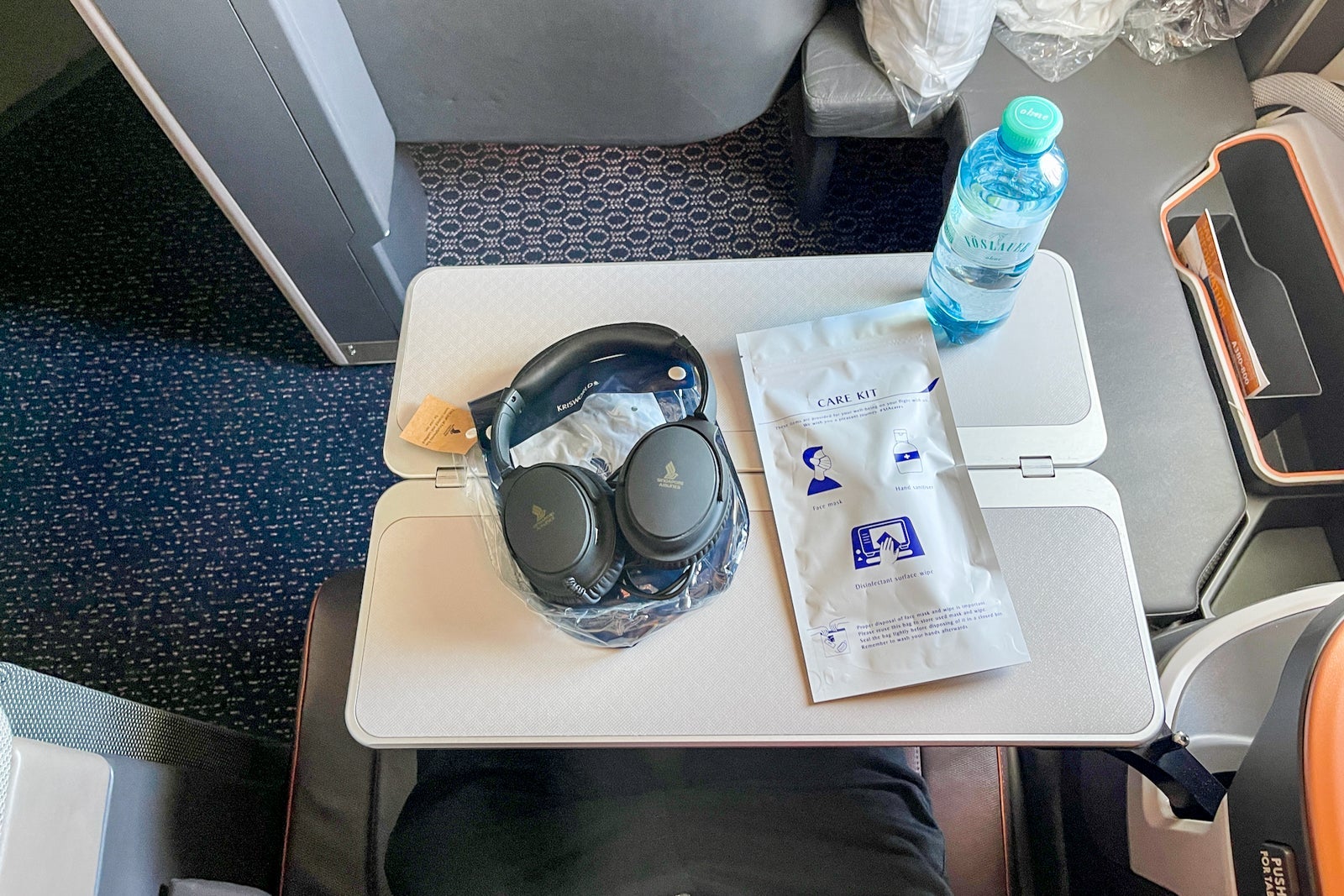 Waiting at my seat during boarding was a pair of noise-canceling headphones, which I thought were decent enough, though not as good as the Bang & Olufsen headphones provided at the very front of the plane. There was also a "care kit" (with a mask, hand sanitizer and disinfectant wipe), a bottle of water, two pillows, a duvet and a mattress pad. The mattress pad was a bit thin, but I still thought the bedding was really comfortable overall.