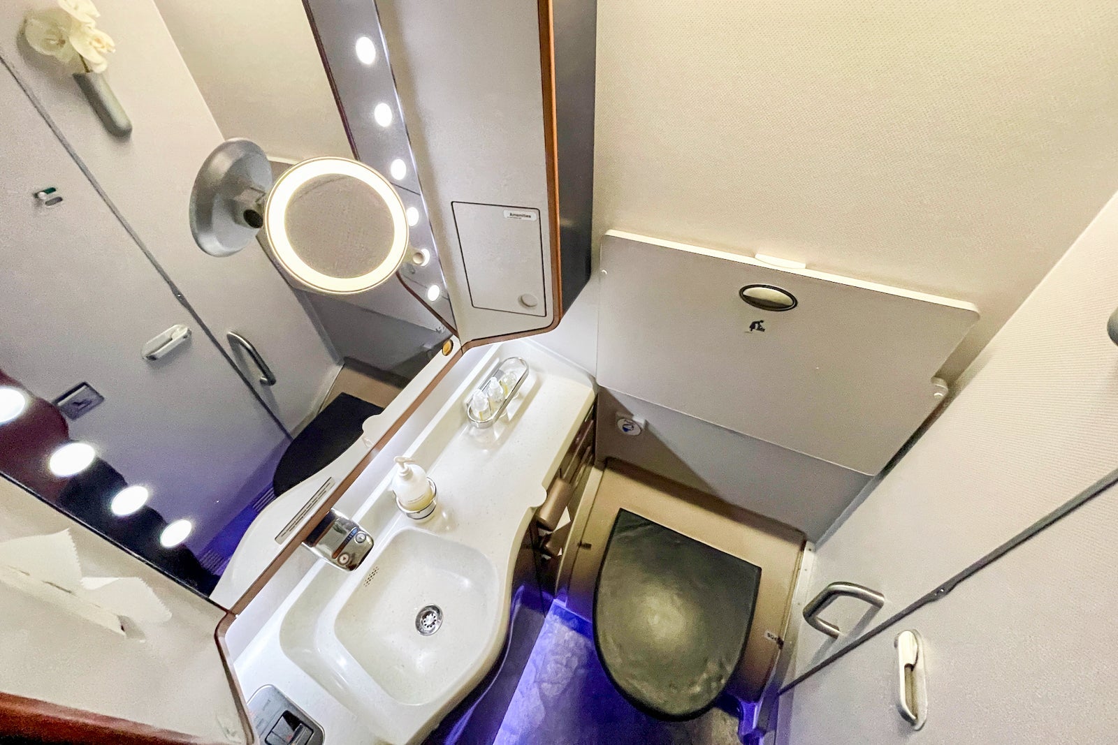 There were seven lavatories in the business-class section which were frequently freshened up by the crew so they remained very clean — the toilet roll was folded each time I went to the bathroom.