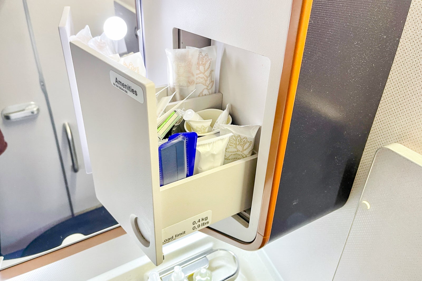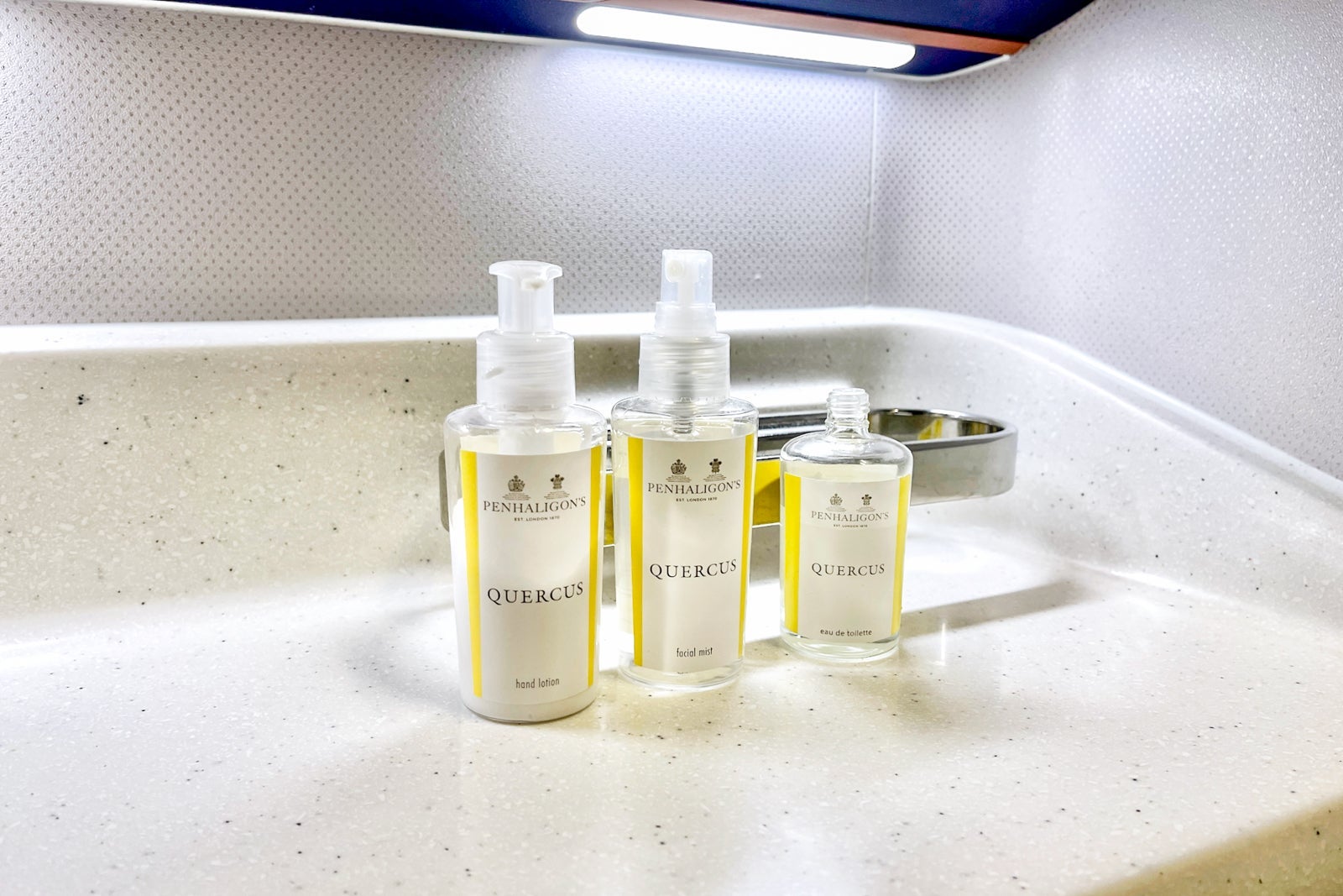 Additional amenities, such as dental kits, shaving kits, eau du toilette, hand lotion and facial mist, were available in the lavatories.