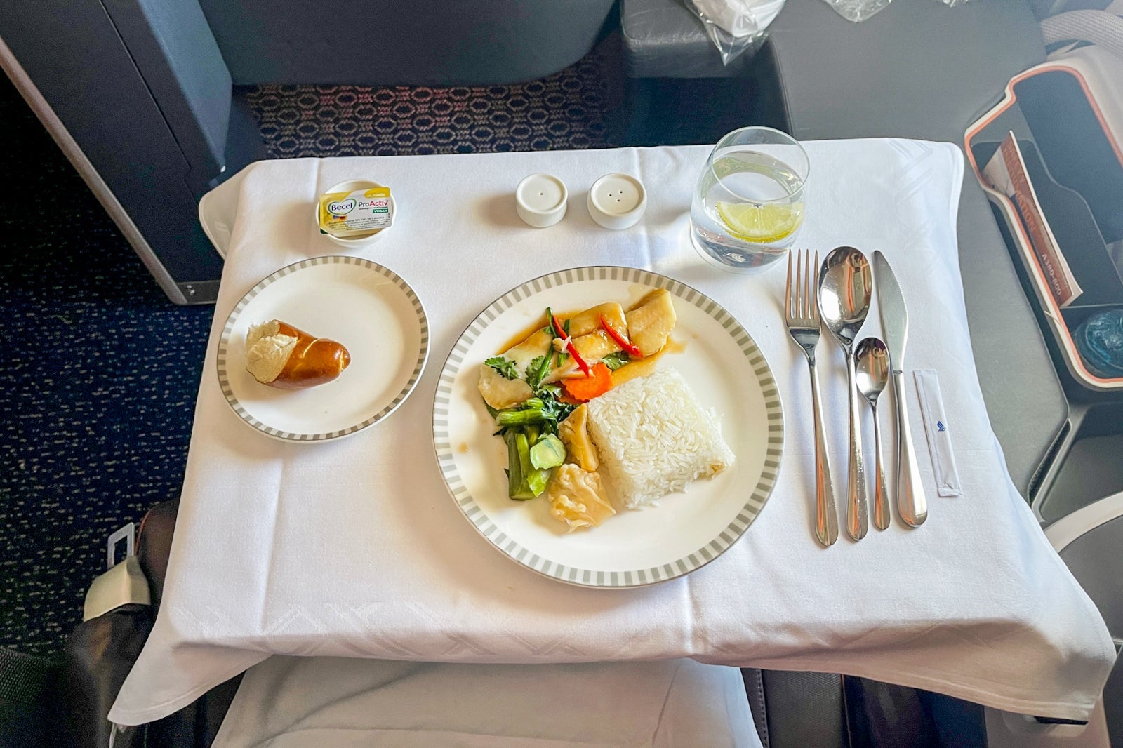 The lunch options were a roasted chicken breast with black truffle jus, steamed halibut fillet, panang nuer (Thai beef curry) or braised pork cheek with carraway jus. Alternatively, there were six off-menu Book the Cook entrees, such as a Bavarian-style pork belly and honey-glazed duckling, available for pre-order. Then, later in the flight, there was a choice between braised egg noodles with prawns or ham and cheese toasties for a pre-arrival snack.