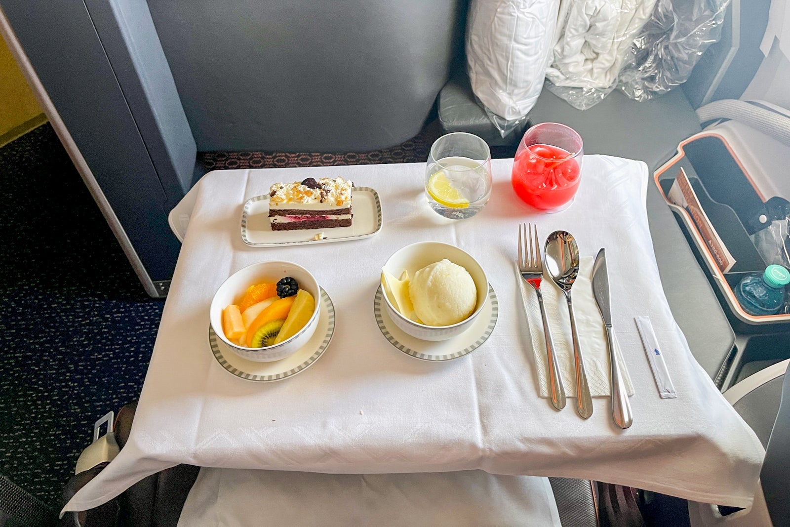 After the main course was completed, a dessert cart was wheeled down the aisle. I had three out of the four options — a black forest gateau, lemon-lime sorbet and fresh fruit — for "research" of course. I skipped the cheese plate but it looked tasty. The entire meal took just under two hours.