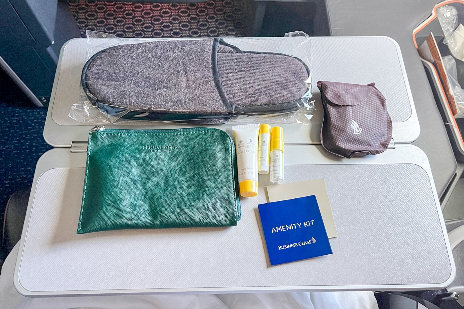 Amenity kits weren't distributed until much later in the flight when most passengers were napping. They were made by the British perfume house Penhaligon's and contained just lip balm, hand lotion and facial mist. To reduce waste, other amenities, such as slippers, socks, earplugs, eyeshades and hairbrushes, were only available by request.