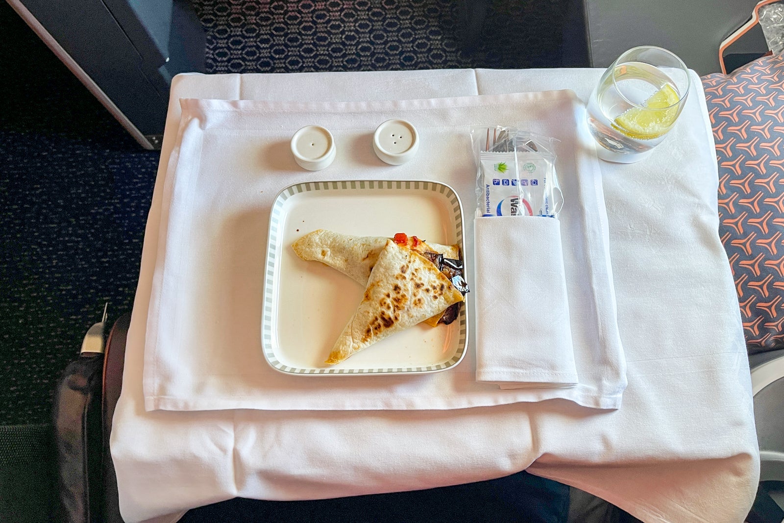 The refreshment was served 90 minutes prior to landing. My special meal consisted of quesadillas stuffed with eggplant, tomatoes and some other vegetables. I'm not the biggest fan of eggplant so I didn't finish it, but it was totally fine, and I appreciated that Singapore served a warm pre-arrival snack.