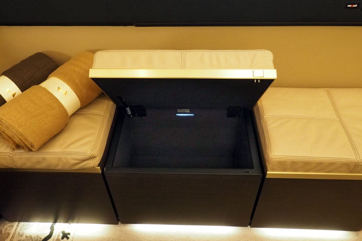 First class doesn't have overhead bins available, so bags need to be stored in compartments built into the ottoman.
