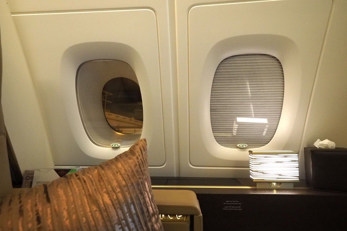 The Residence, The Apartment and business-class seats all include windows with automatic blinds. Note that while some Apartments have three windows each, The Residence only has two.