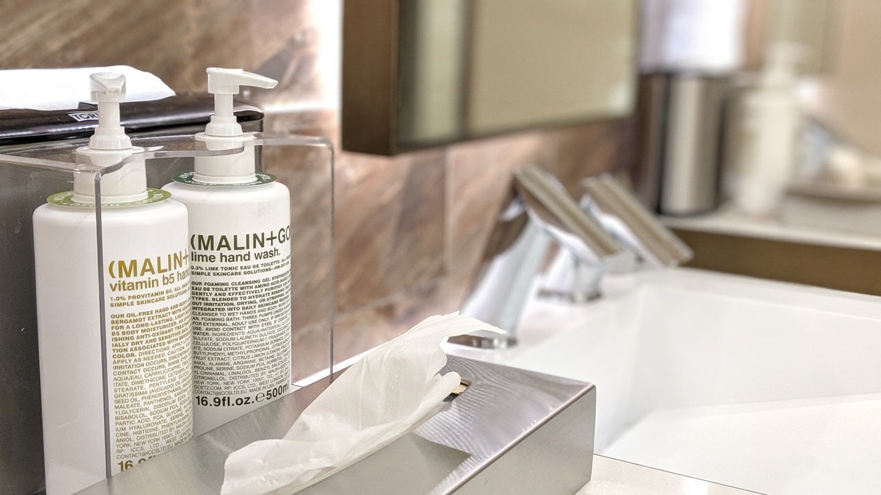 The sinks feature Malin + Goetz amenities and the all-gender bathroom includes ample space for wheelchairs and strollers as well as a changing table.