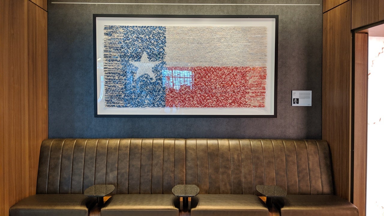 Located on the mezzanine level of the terminal, the 9,000-square-foot lounge is "classy Texas," featuring warm walnut wood and metal finishes, as well as artwork from local artists.