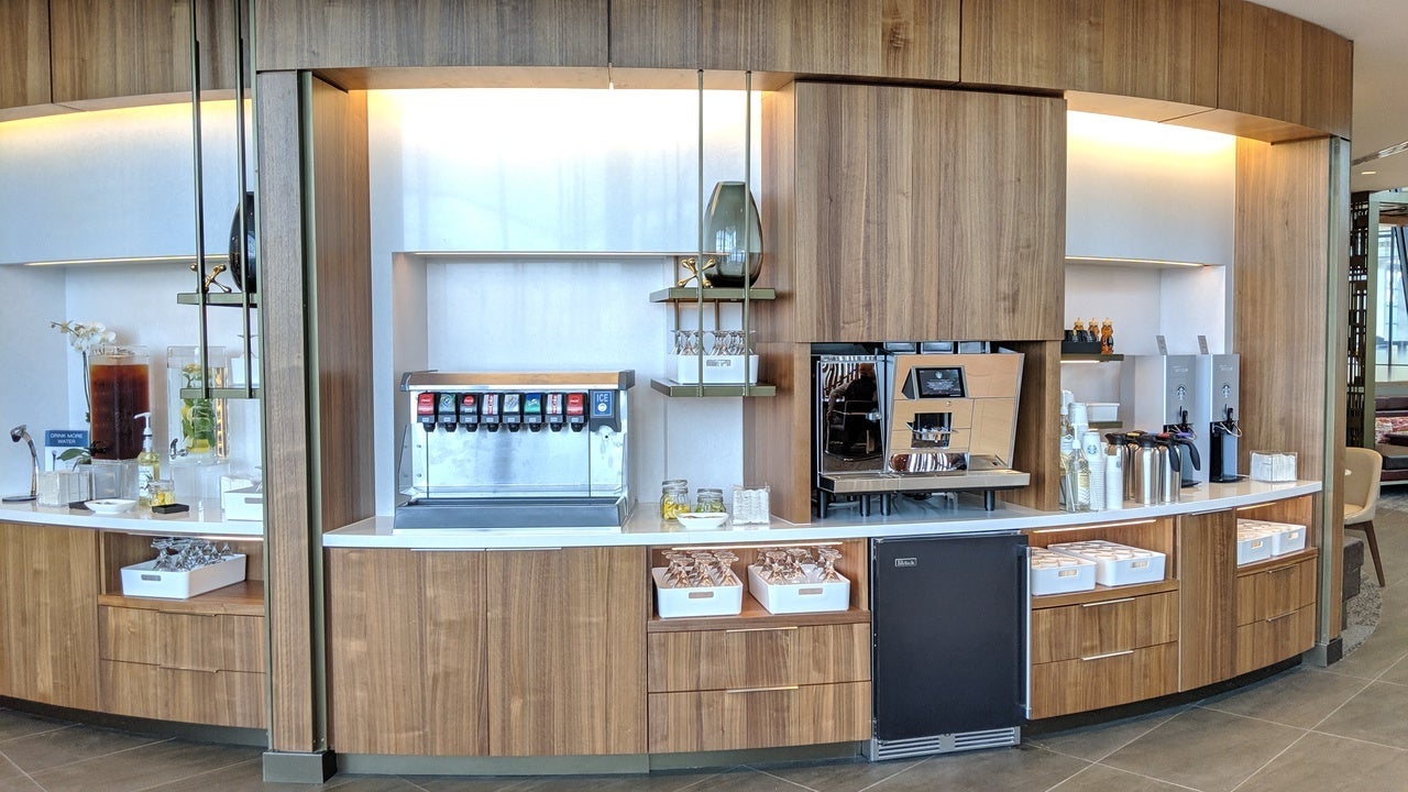 Around the circular seating area, there's a self-serve bar with iced tea, citrus-infused water, soft drinks and several different coffee machines.