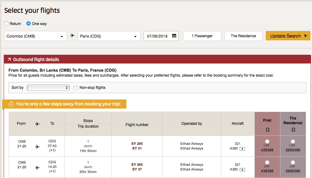 At this point, even originating in Cairo or Colombo, the two proven gateways for discounted airfares, they still price out at around $15,000-$21,000 one-way, and $19,000-$32,000 round-trip. Overall, the best deals I could find at the moment were one-ways from Colombo (CMB) to Paris (CDG) for 2,650,386 Sri Lankan Rupees ($15,694).