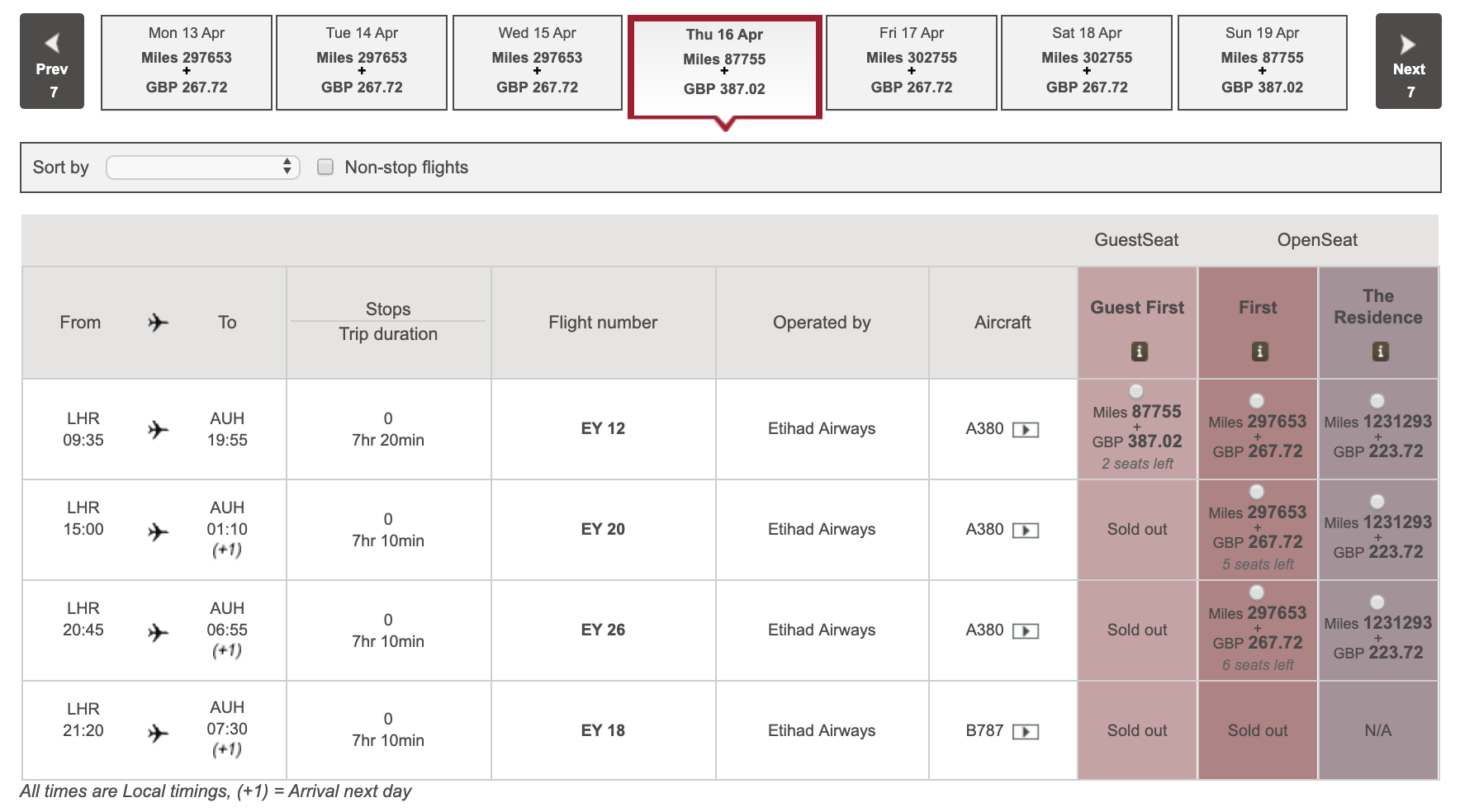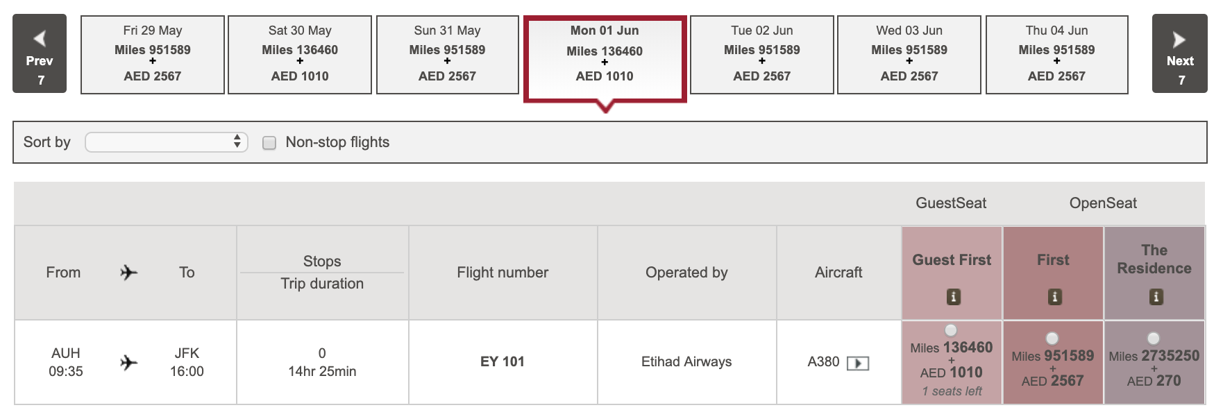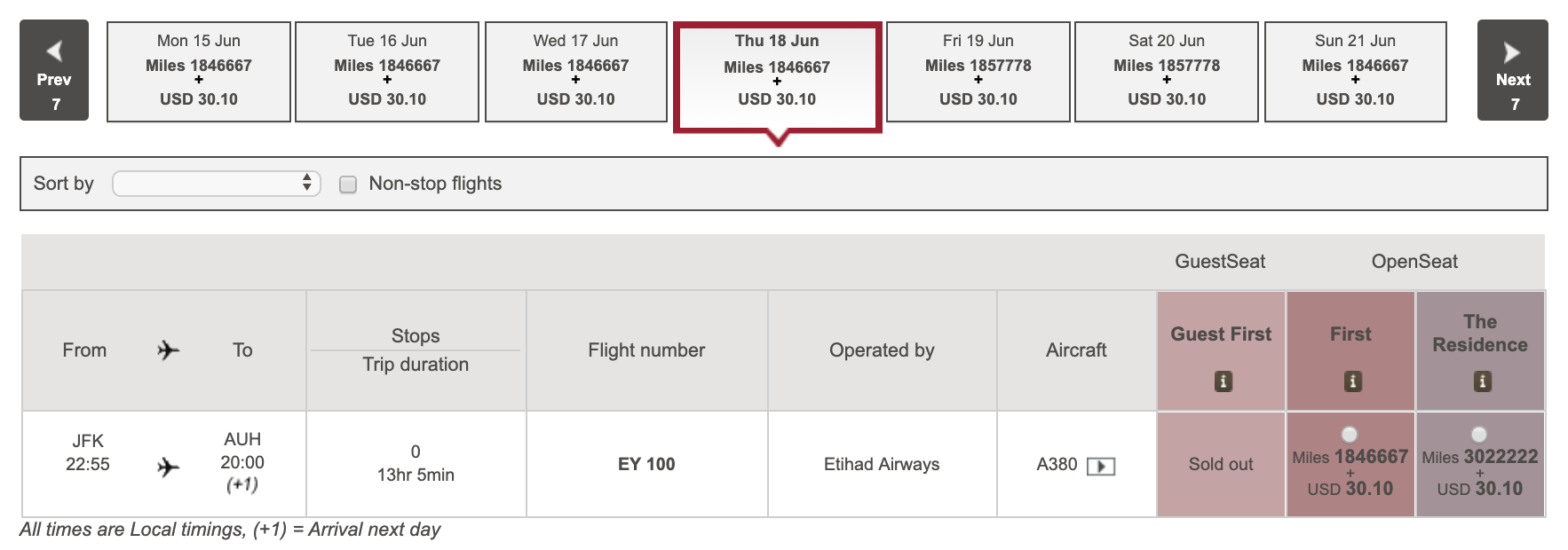 Here's a sample day where awards in both the Residence and First Apartments are available from Abu Dhabi to New York.