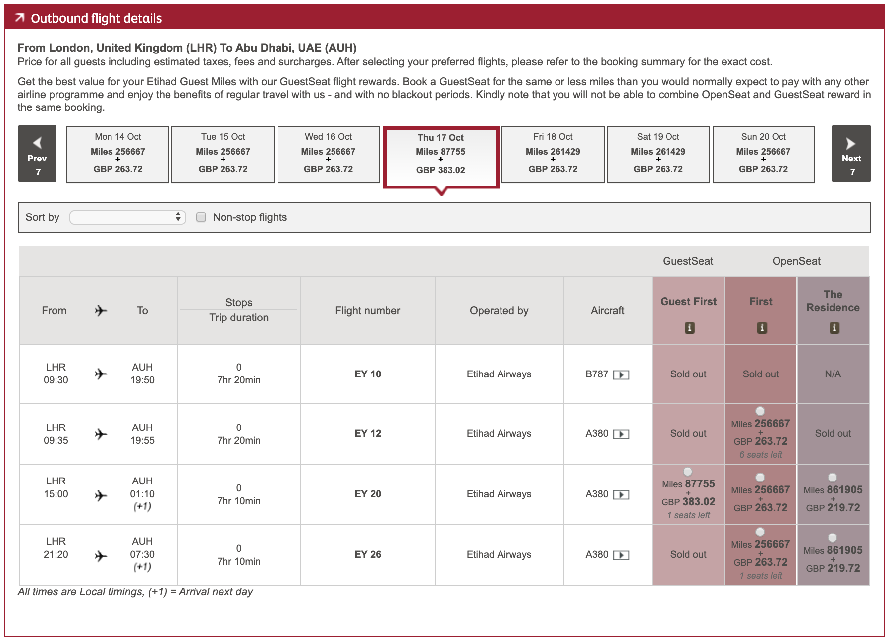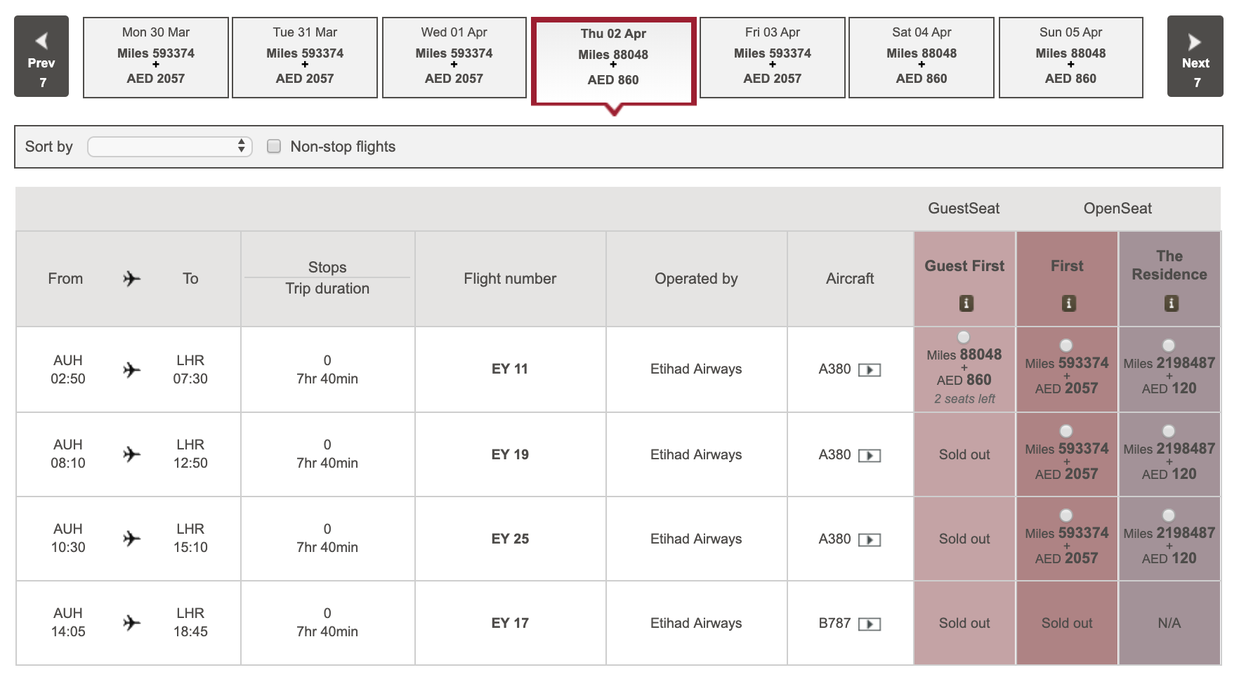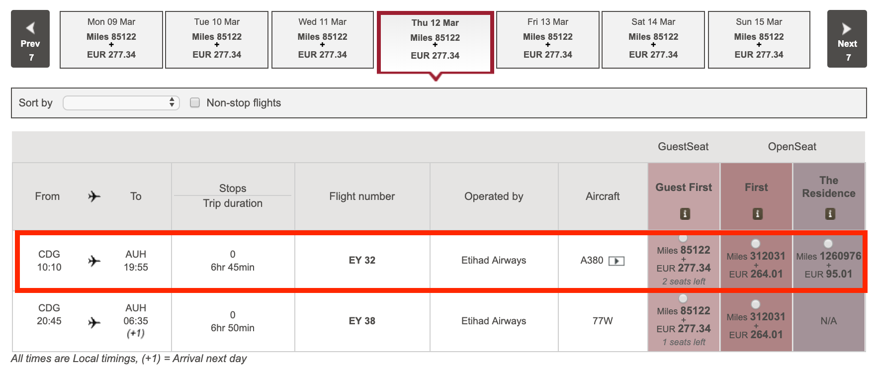 Here's a sample day where awards in both the Residence and First Apartments are available from Abu Dhabi to New York.