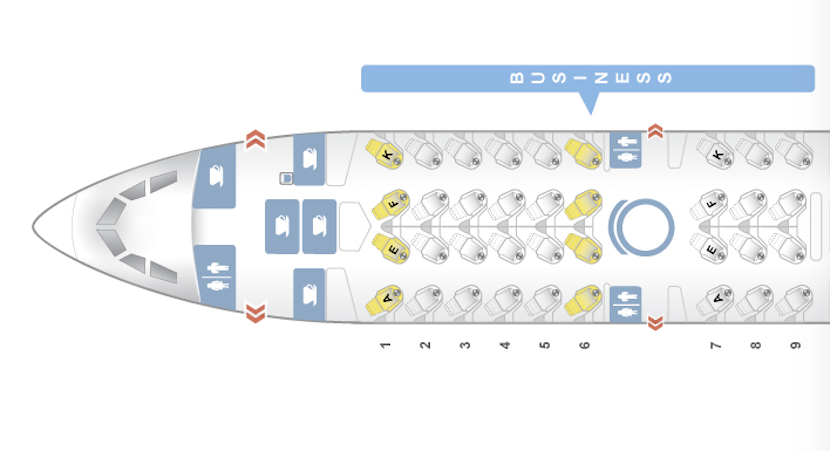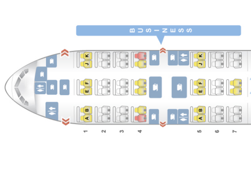 The odd-numbered rows have rear-facing seats, while even-numbered rows have forward-facing ones. The rear-facing seats on the sides are closer to the window for more privacy, while those facing forward are closer to the aisle. In addition, those in the center sections are closer together when they're rear-facing and farther apart in the front-facing rows.