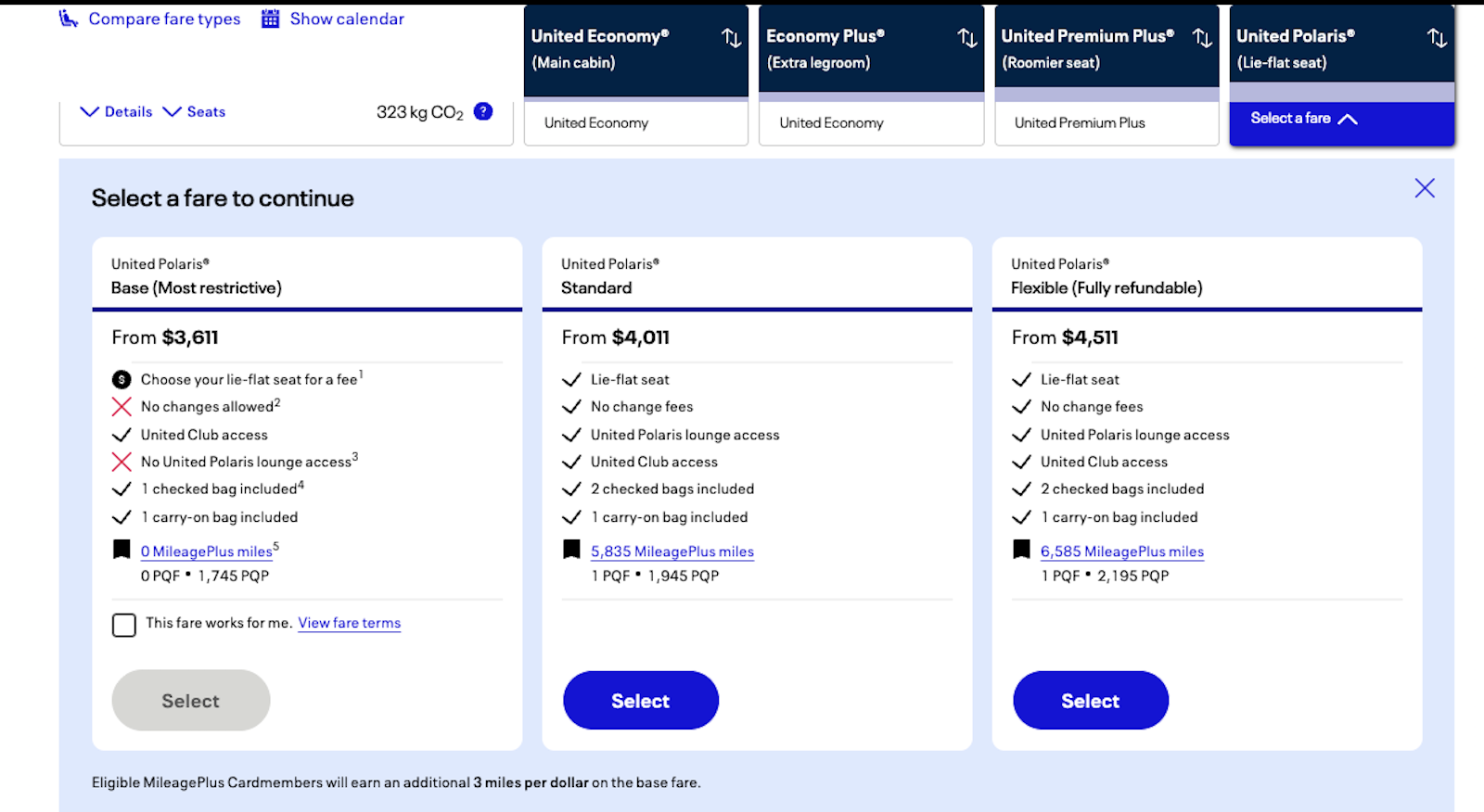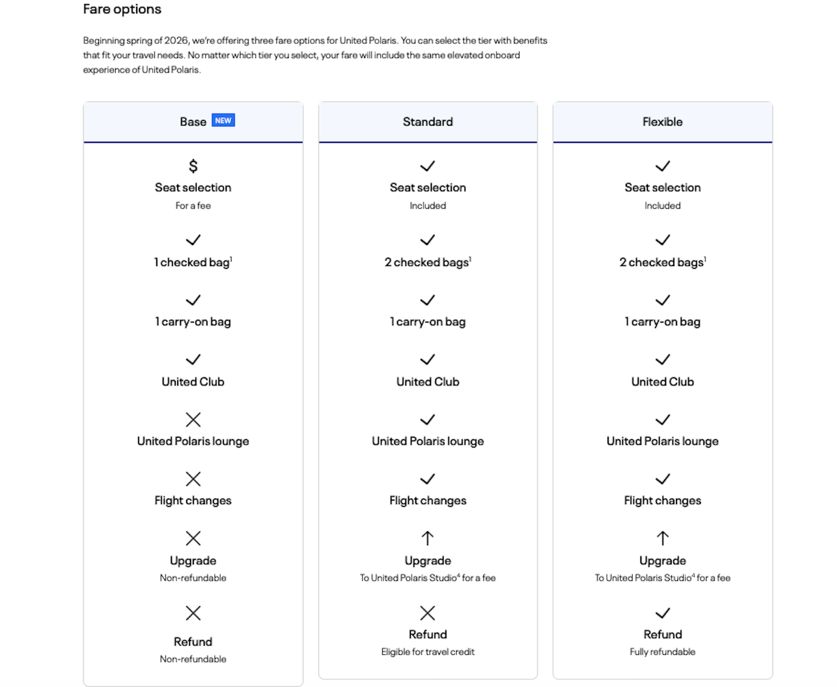 Here's a full chart United has published to help you decide which Polaris fare is right for you. The carrier now offers "base," "standard" and "flexible" fares, which are beginning to roll out across its international network.