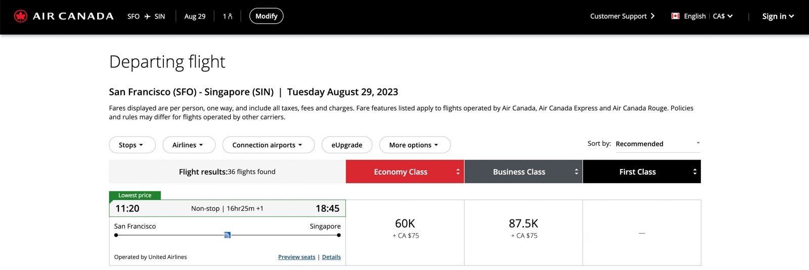 However, Air Canada Aeroplan required just 87,500 miles plus 75 Canadian dollars ($55) for the same ticket. It seemed worth spending $50 more to save 12,500 miles, so that's how I booked it.