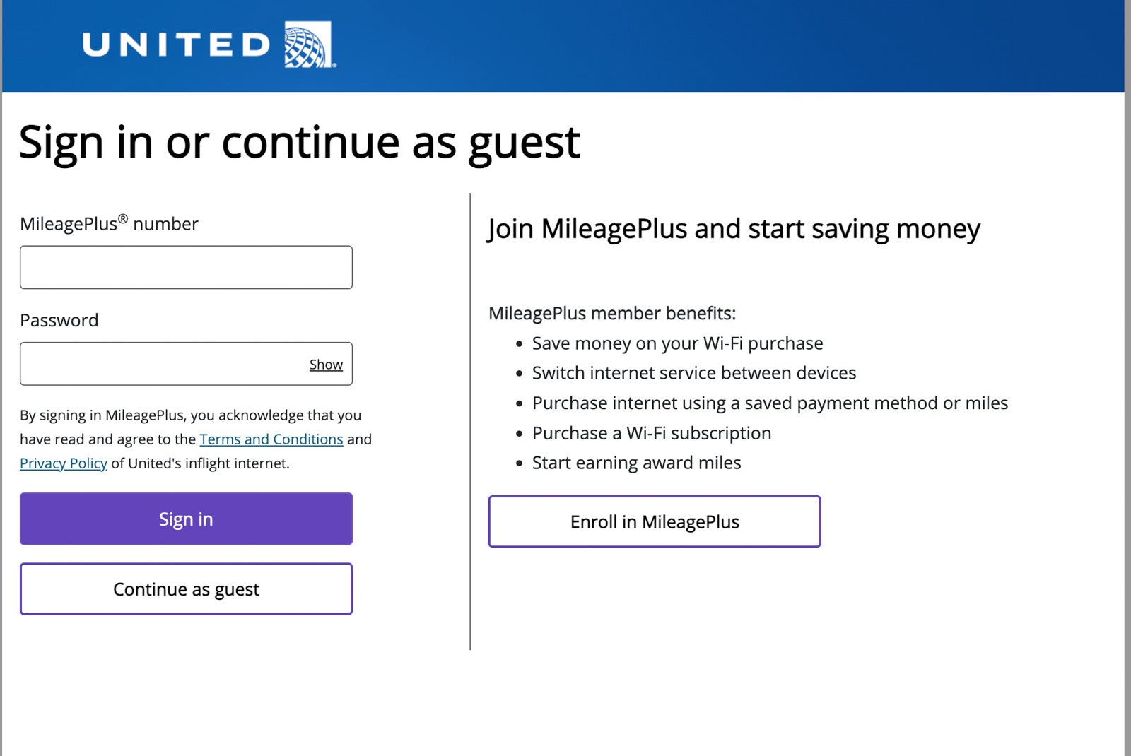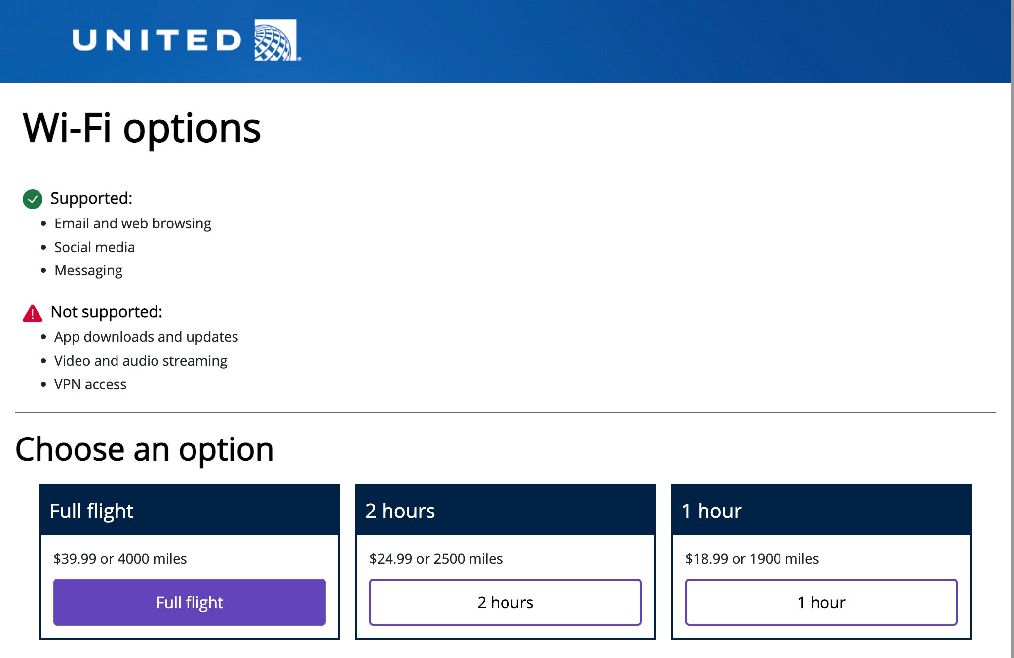 - Two hours for $24.99 or 2,500 United MileagePlus miles