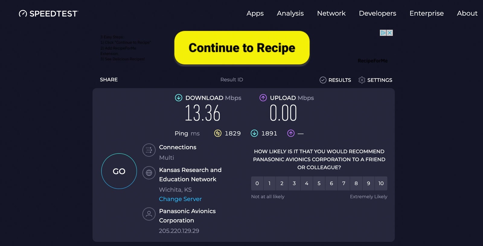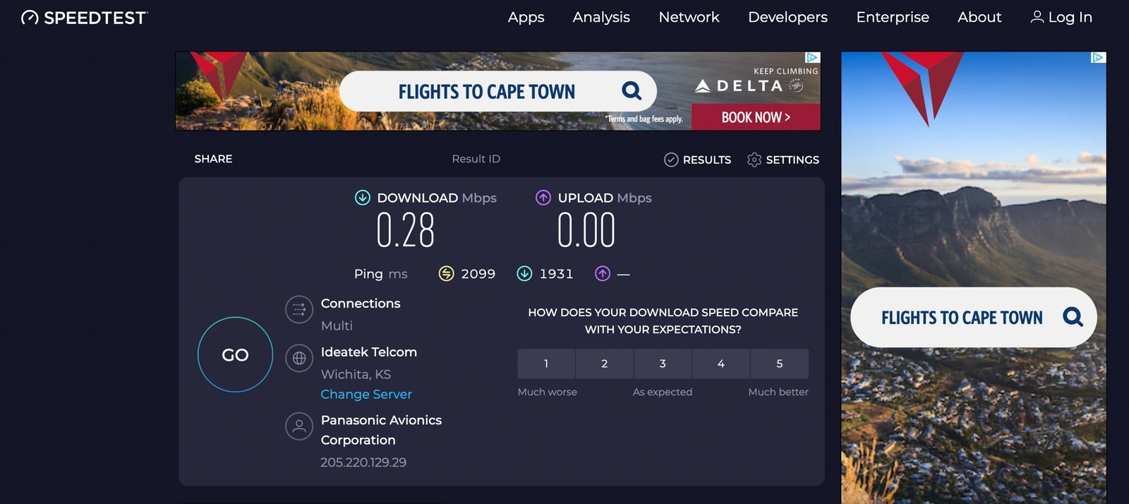 I chose the full-flight option, and though I experienced speeds of just 0.28 Mbps download and 0 Mbps upload for the first few minutes, that eventually rose to a respectable 13.36 Mbps download. Speedtest continued to register 0 Mbps upload, but that didn't seem to be accurate, and I was able to browse the internet, send emails, use messaging apps and upload some photos at decent speeds.