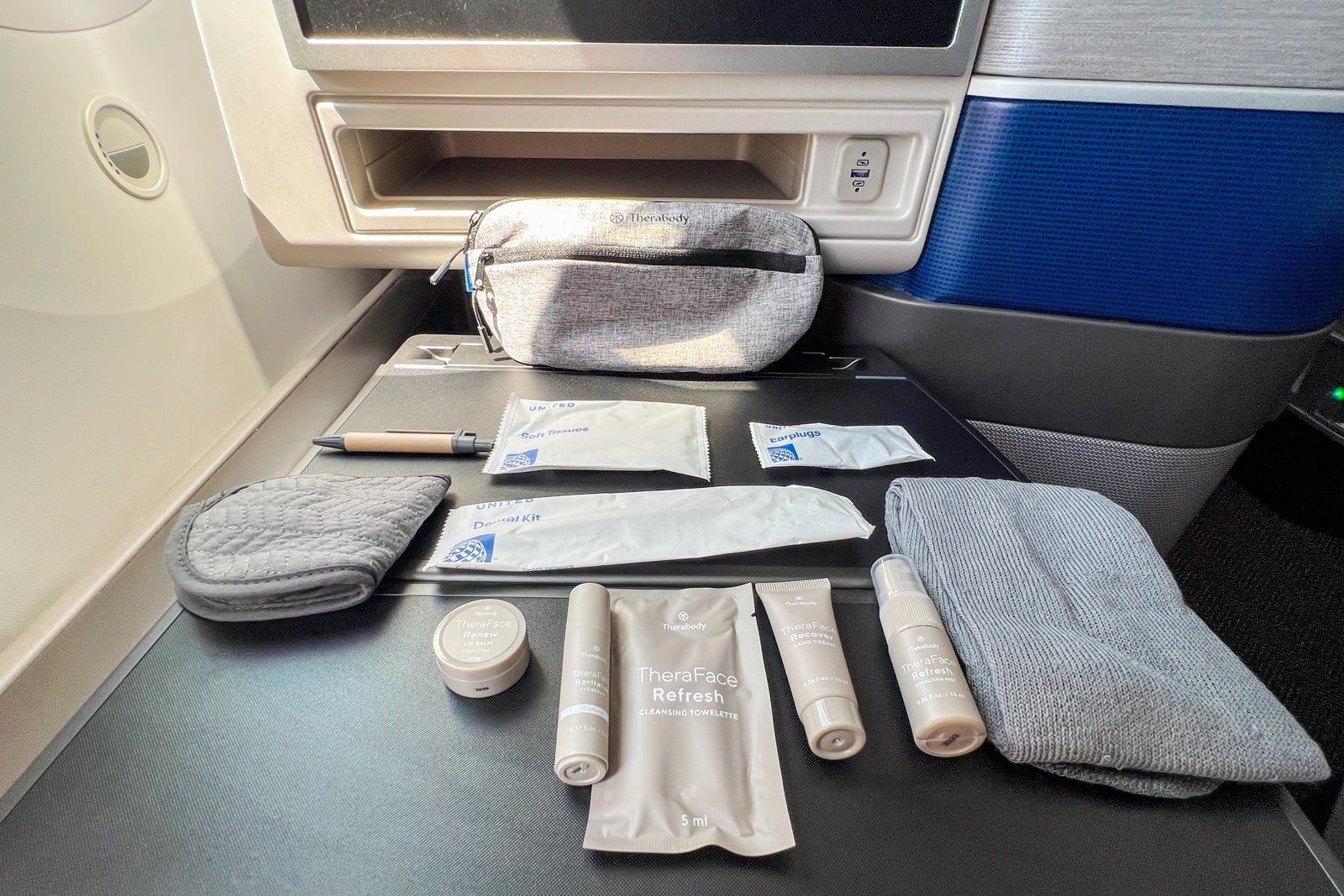 There were also amenity kits in the form of gray fabric Therabody cross-body bags. They contained the following skincare and other products: