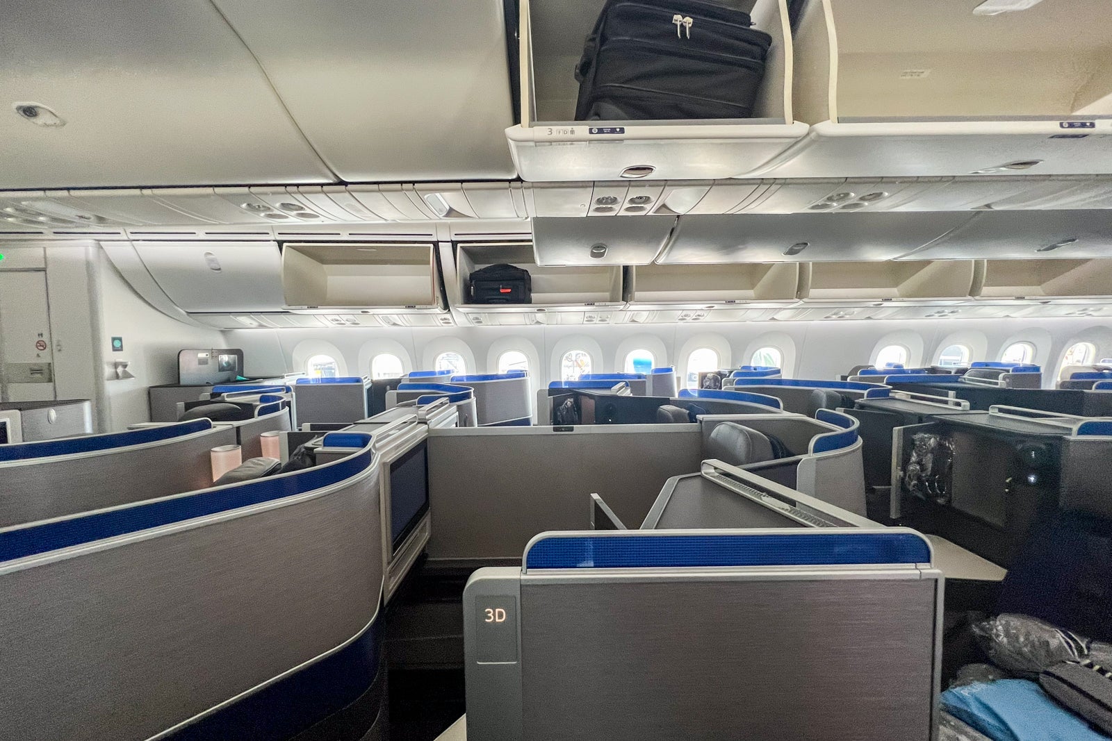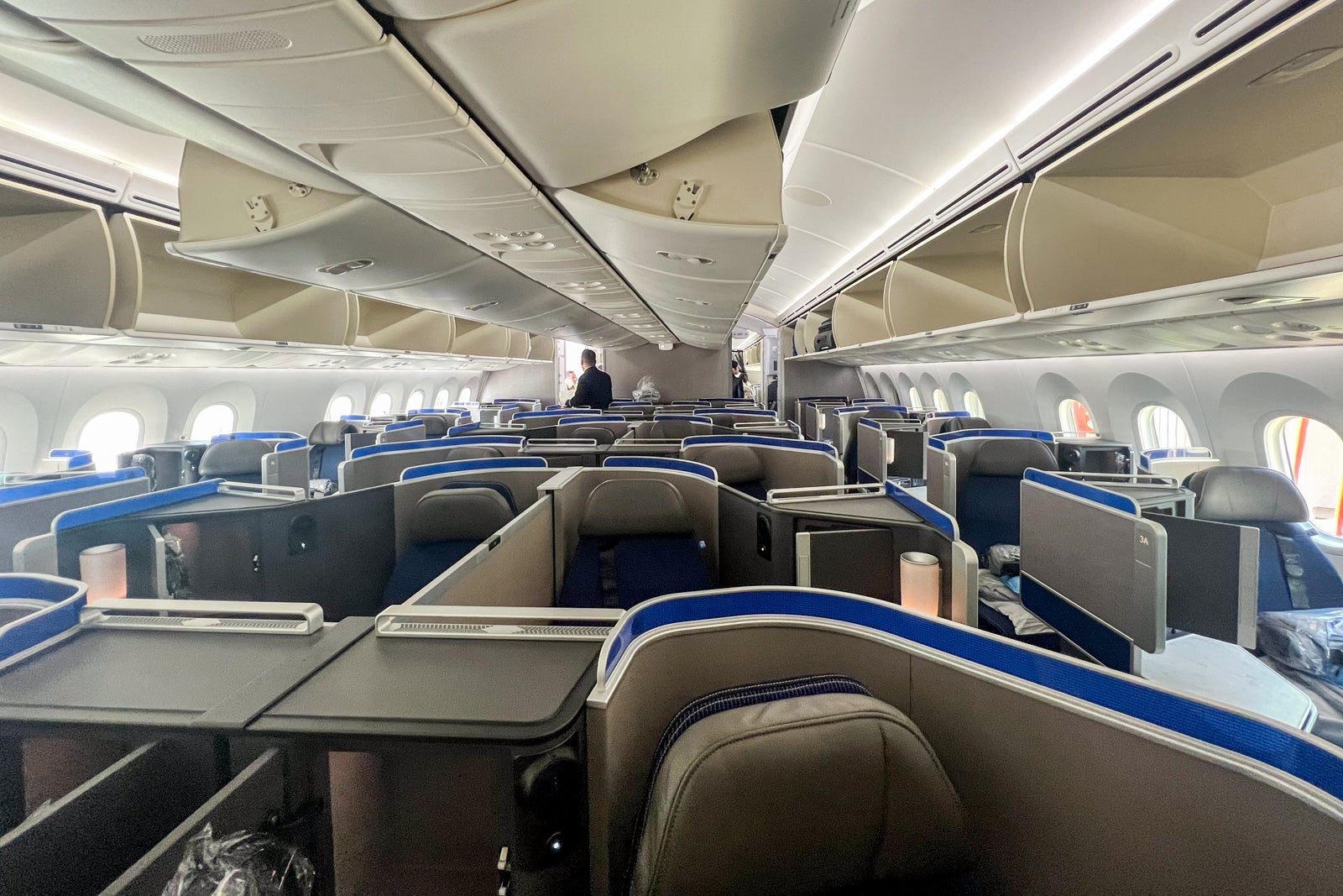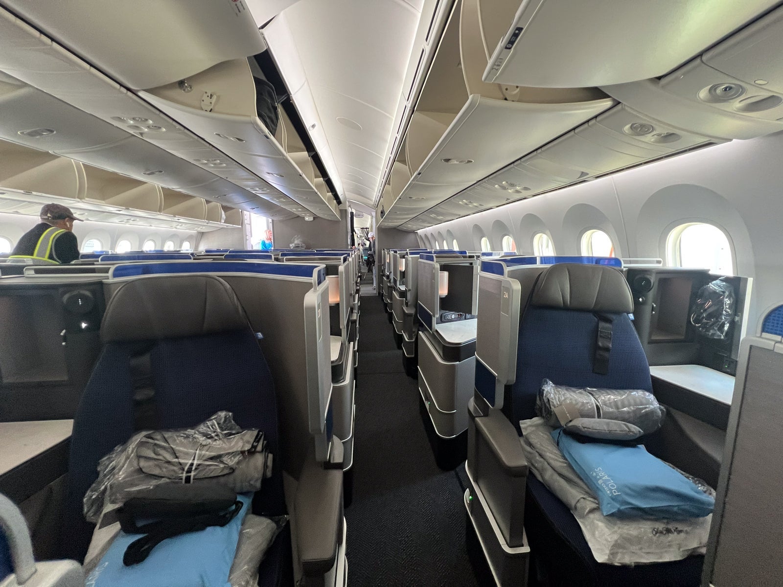 United's Boeing 787-9 Dreamliners have 48 United Polaris business-class seats in total — eight rows of four seats each in a large forward cabin and four rows of four seats each in a smaller aft cabin.