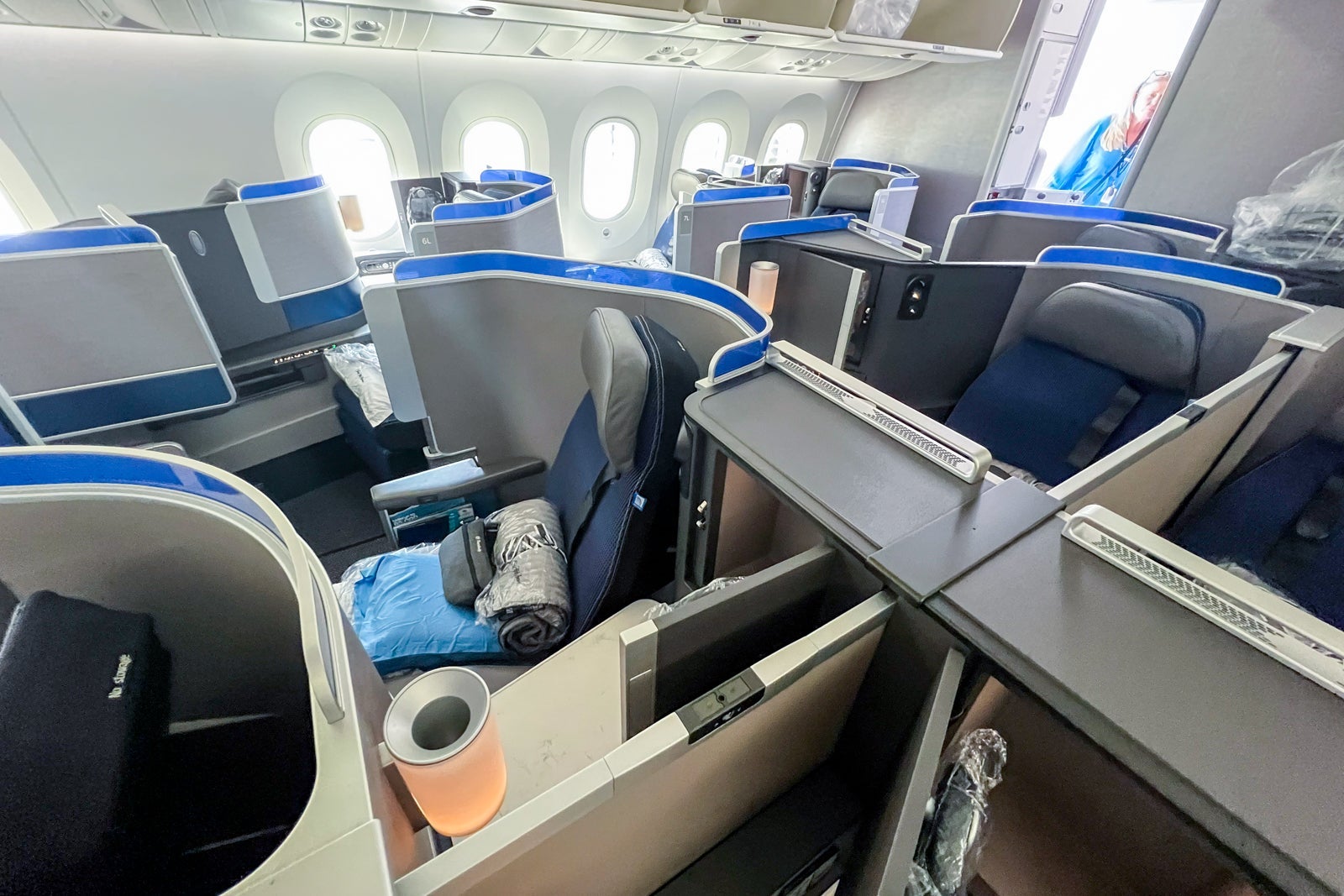 Although laid out in a 1-2-1 pattern, United's Polaris seats are a little different from the reverse-herringbone-style ones you'll find on other airlines like American Airlines or Air France.