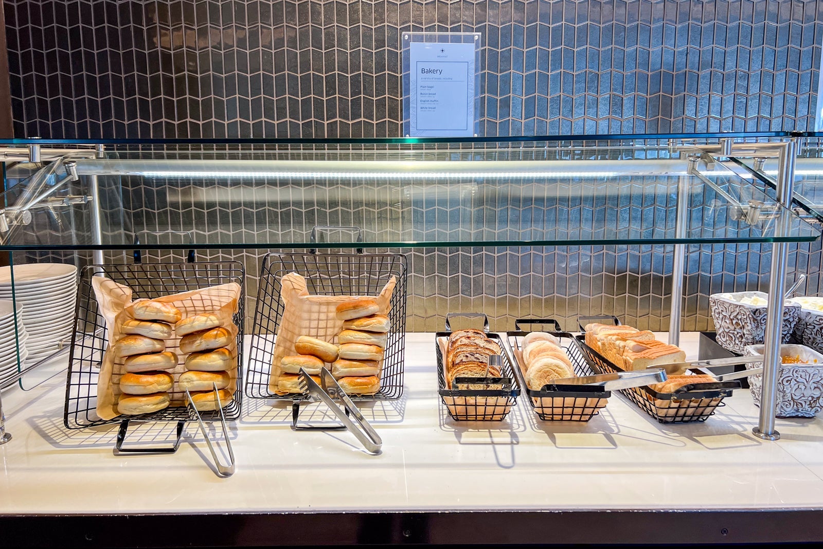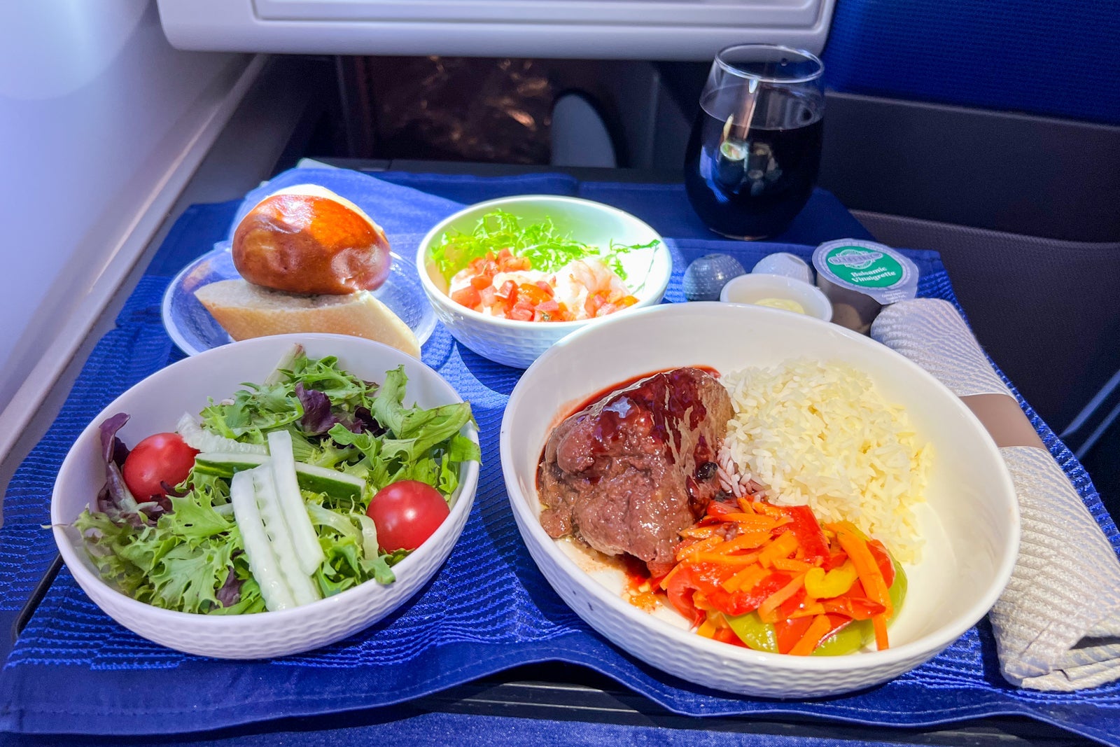 Twenty minutes after that, meal service commenced, with both starters and mains being served on a single tray. After those were distributed, the flight attendants came through with a hot selection of bread, including pretzel rolls and garlic bread, and refilled drinks.