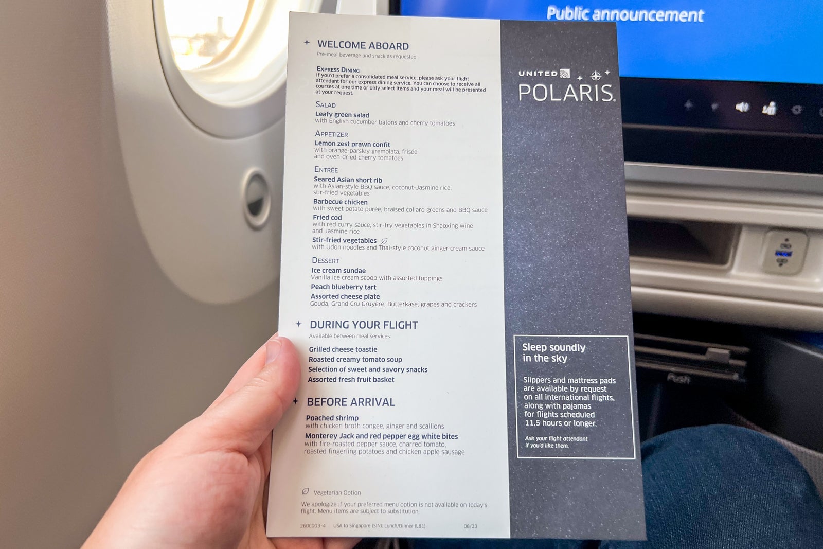 Polaris passengers boarded to find a variety of goodies waiting for them on their seats, including full-size Saks Fifth Avenue pillows and duvets (wrapped with a ribbon), smaller memory-foam pillows, lightweight blankets and sets of slippers stowed in the foot cubby.