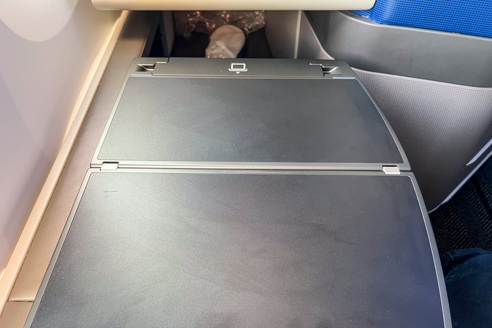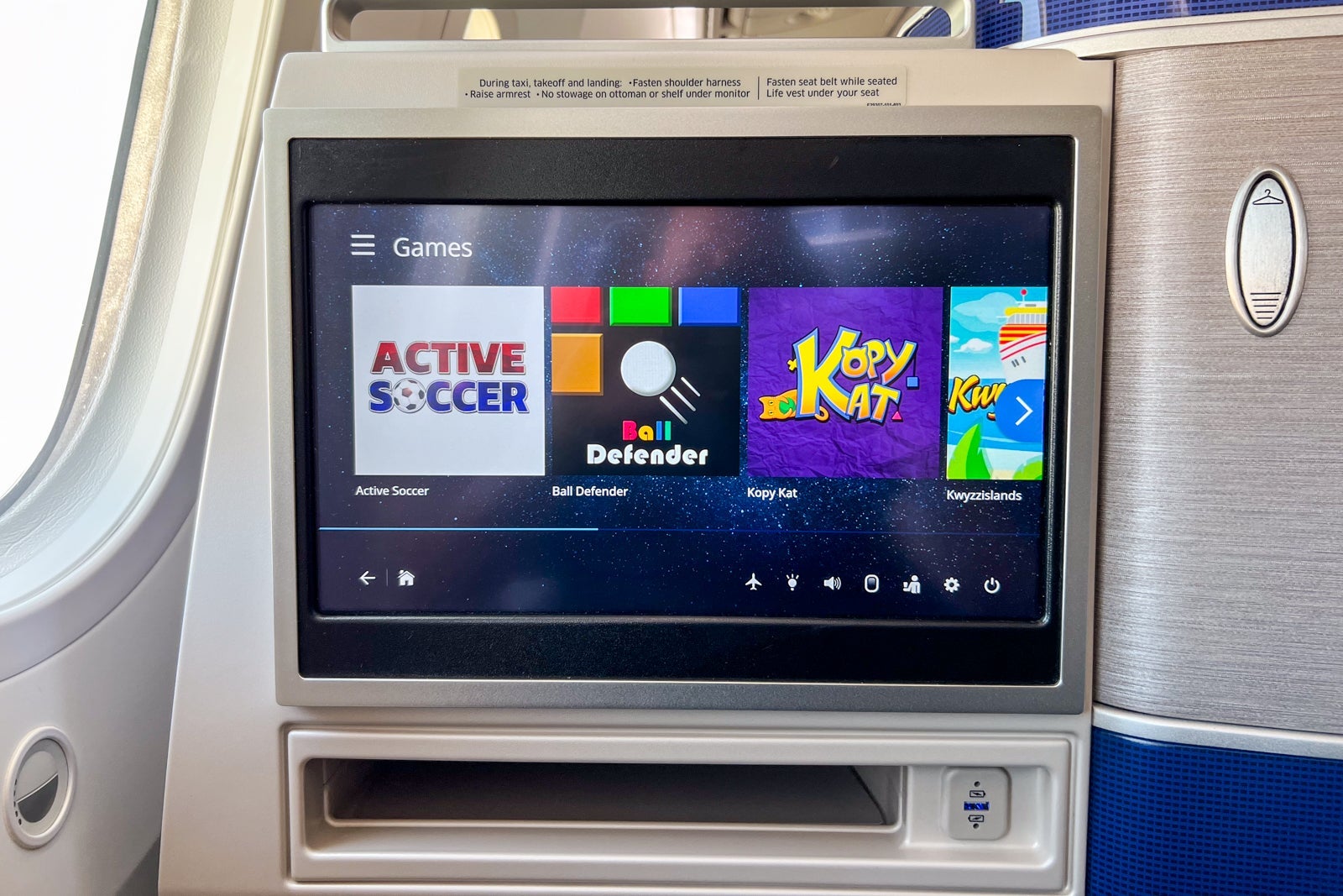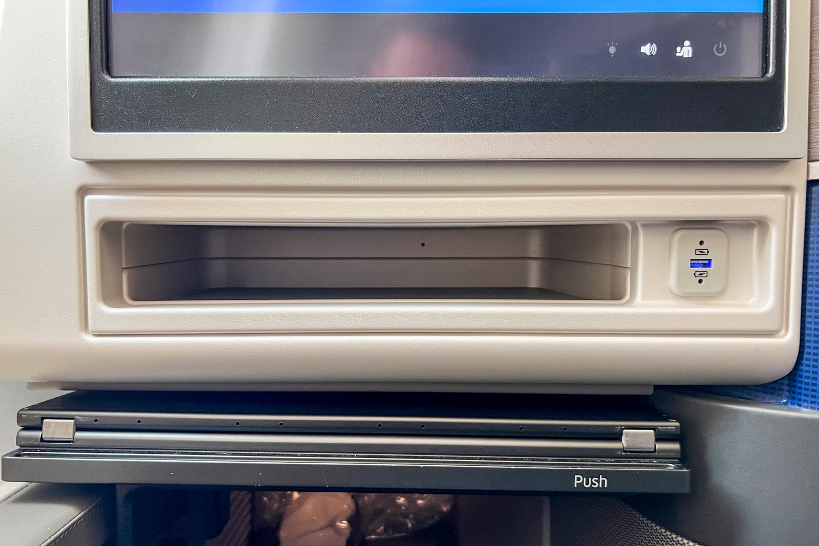 Opposite the seatback, there's a narrow shelf under the entertainment screen with another USB-A port under it, making it a convenient place to charge a mobile phone without cords getting in the way.