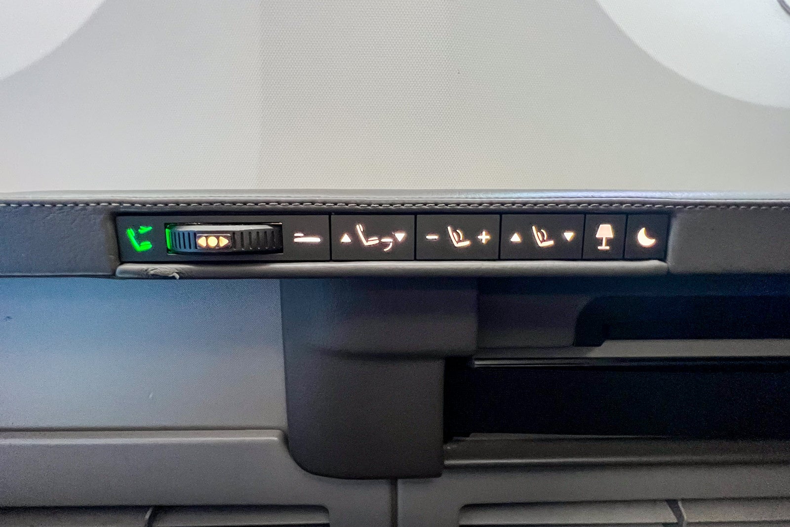The seat controls consist of a wheel that scrolls one way or another to put the seat into lie-flat mode or raise it fully upright. There are also buttons to maneuver the individual seat components like the backrest and armrest into comfortable lounging positions, though these movements are somewhat limited.